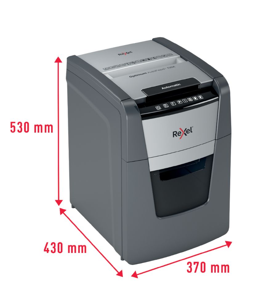 Destructeur de papier, de cartes de crédit, de documents Optimum Autofeed+ 100X équipé d'une coupe croisée pour une destruction en particules 4 x 28 mm et un niveau de sécurité P-4. Corbeille amovible de 34L. Conçu pour un usage professionnel dans un bureau de taille moyenne de 1 à 5 personnes, utilisable en continu pendant 20 minutes. Mise en veille après 3 minutes d'inutilisation.