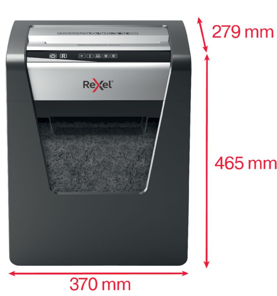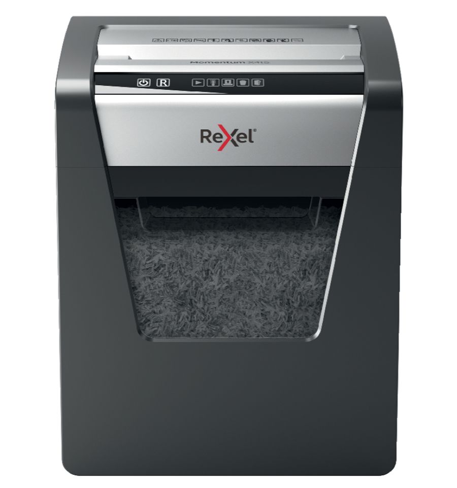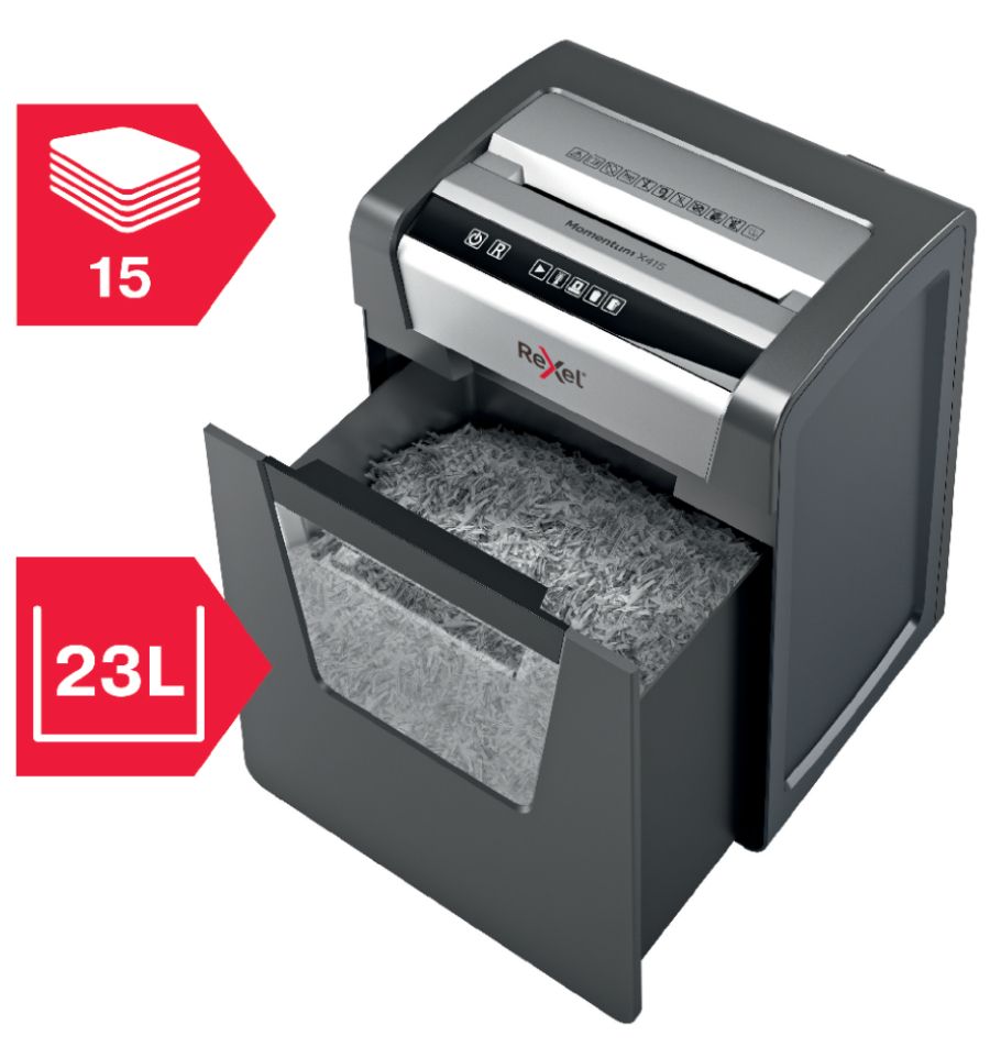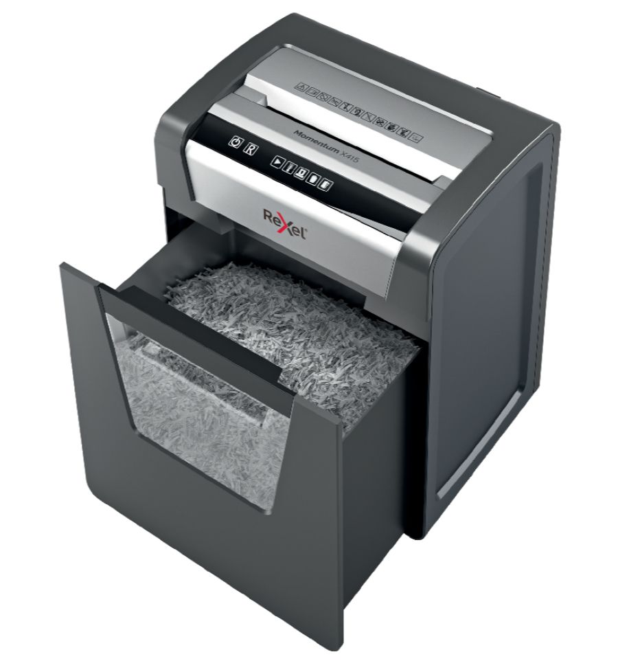 Destructeur de papier manuel Momentum X415 Rexel avec coupe croisée pour une destruction en particules 4 x 40 mm et un niveau de sécurité P-4. Corbeille de 23 litres. Idéal pour les petits bureaux. Jusqu'à 2 heures de fonctionnement.