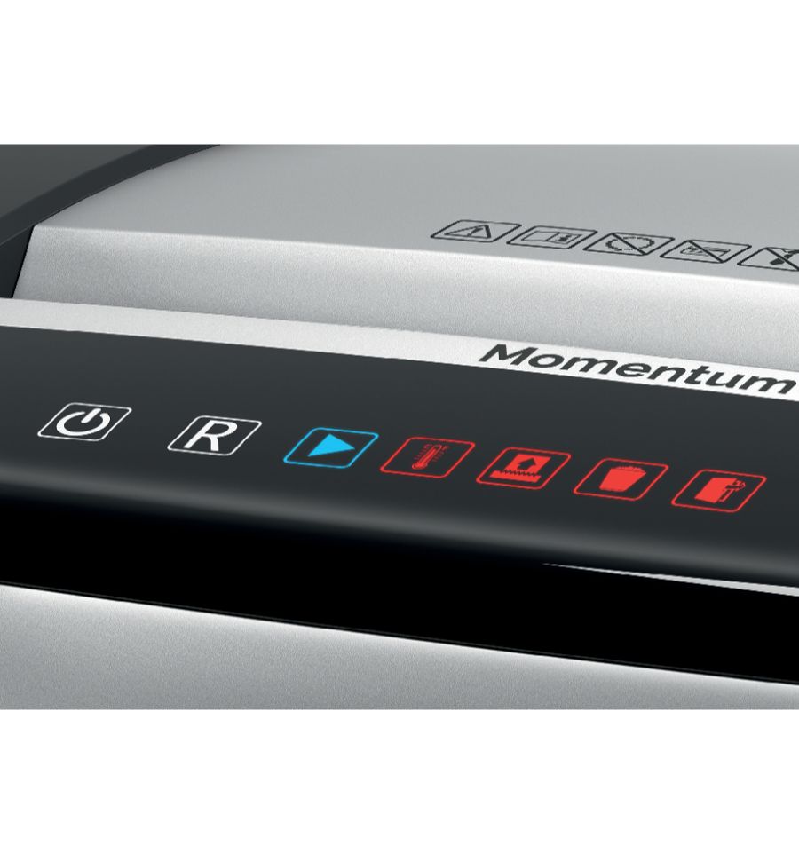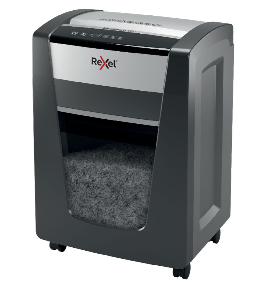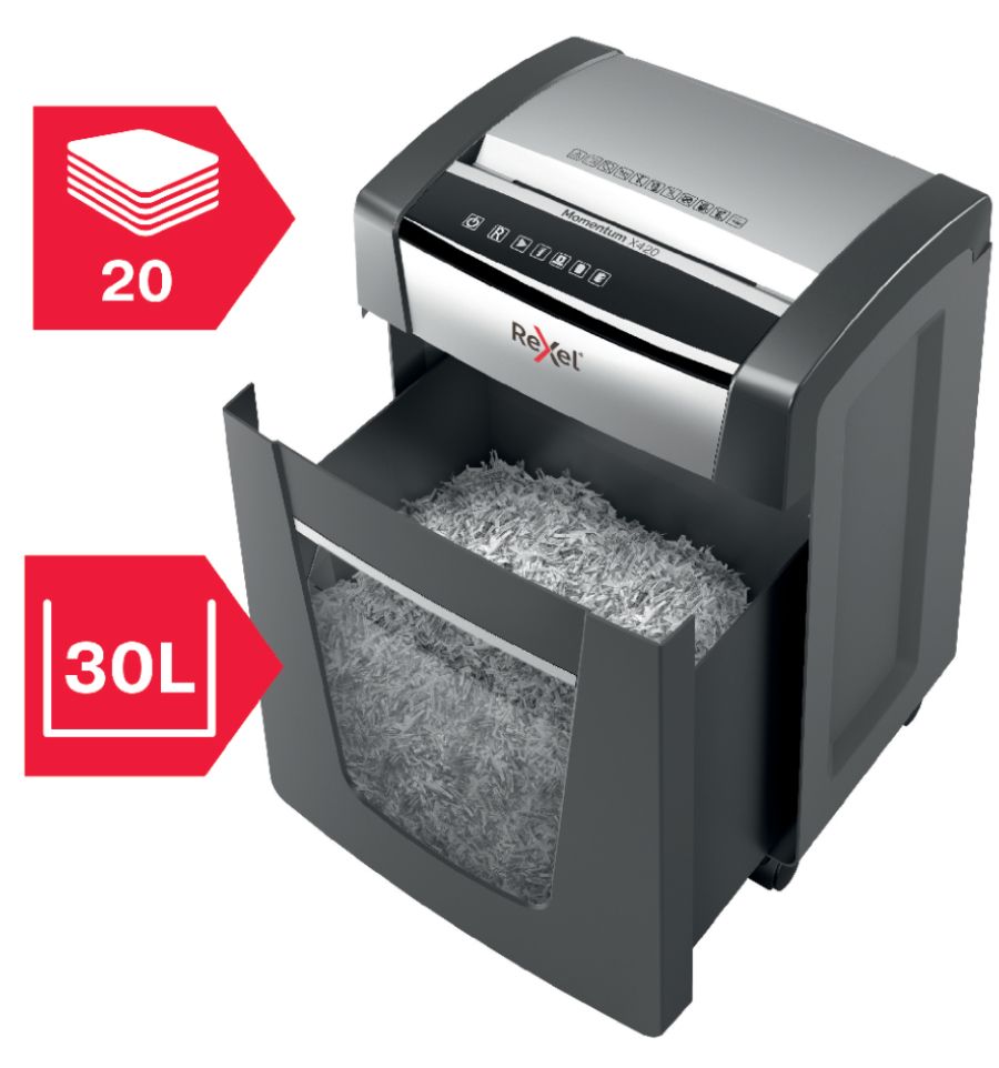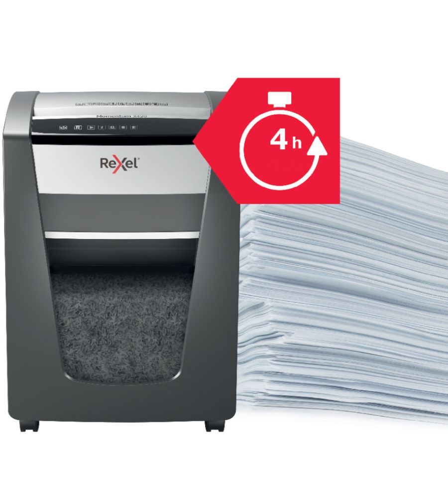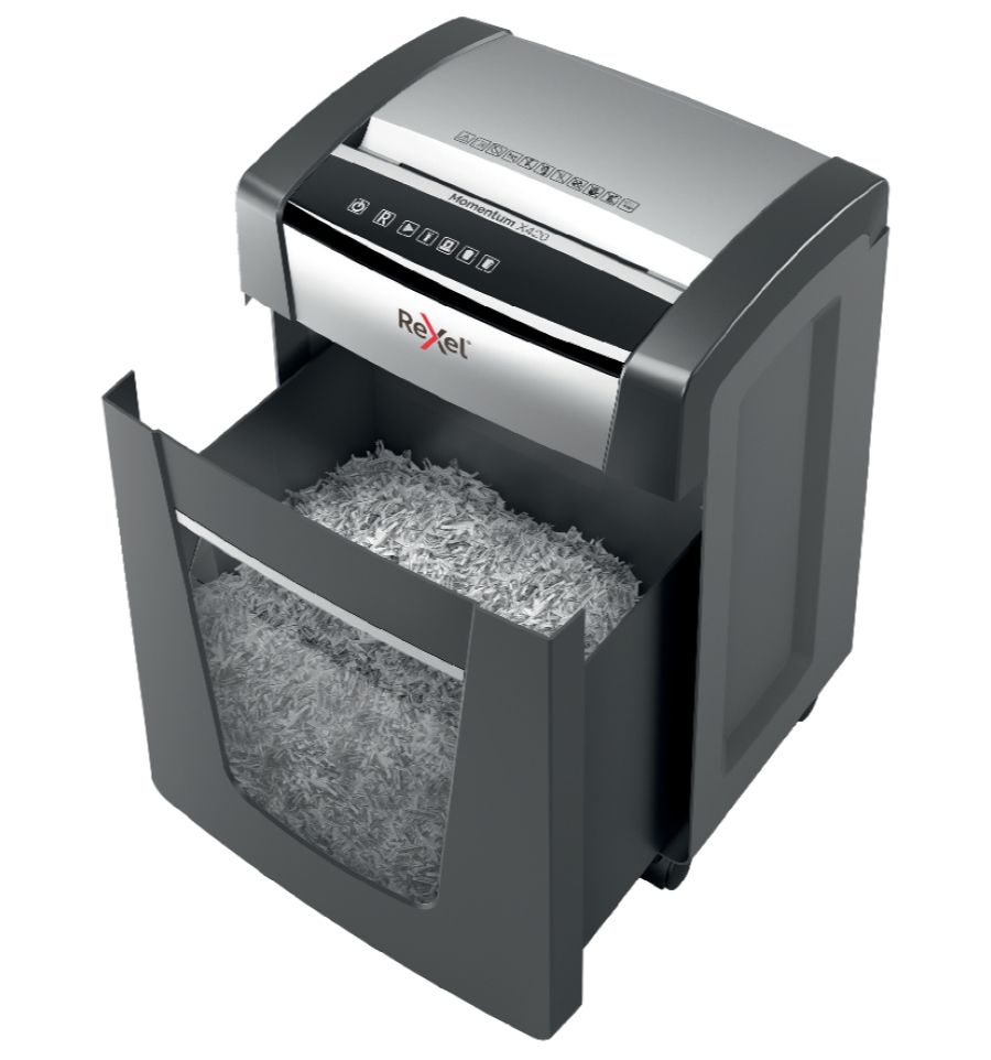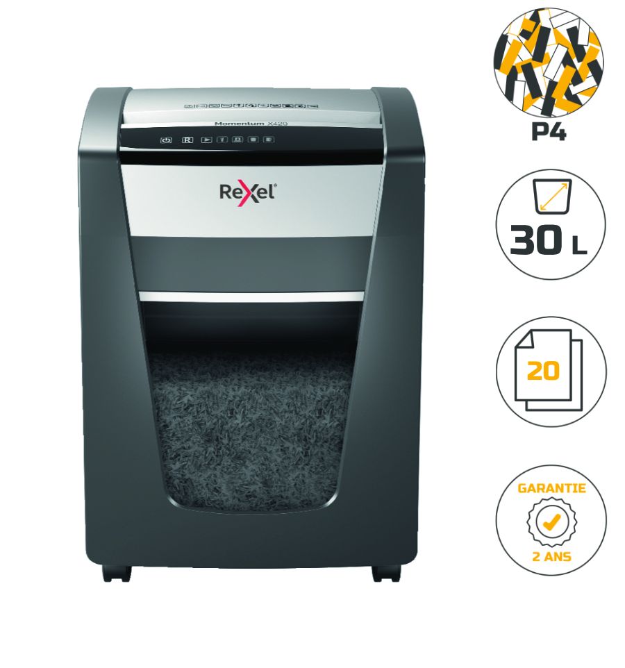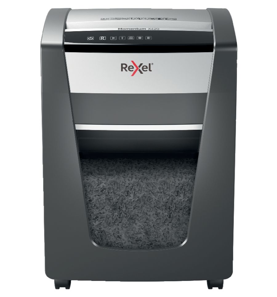 Destructeur de papier manuel professionnel Momentum X420 Rexel avec coupe croisée pour une destruction en particules 4 x 40 mm et un niveau de sécurité P-4. Corbeille de 30 litres. Jusqu'à 4 heures de fonctionnement.