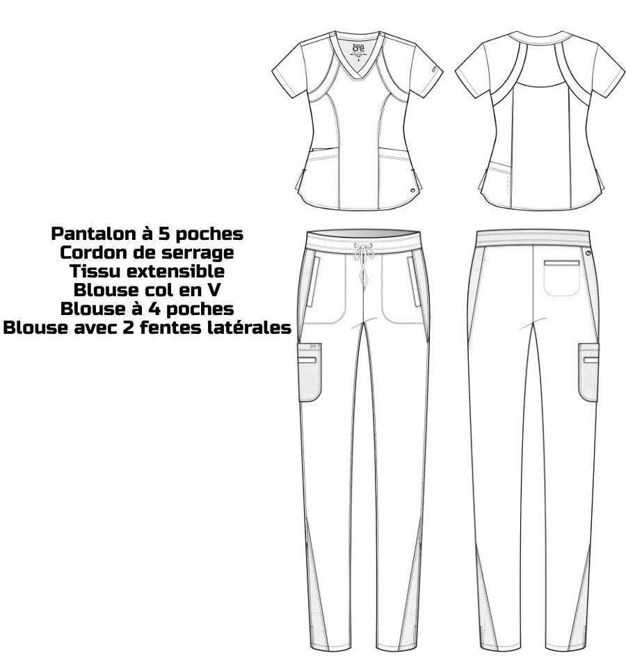 Optez pour la tenue de travail femme aide soignante disponible en 2 coloris, composée d’une blouse et d’un pantalon.