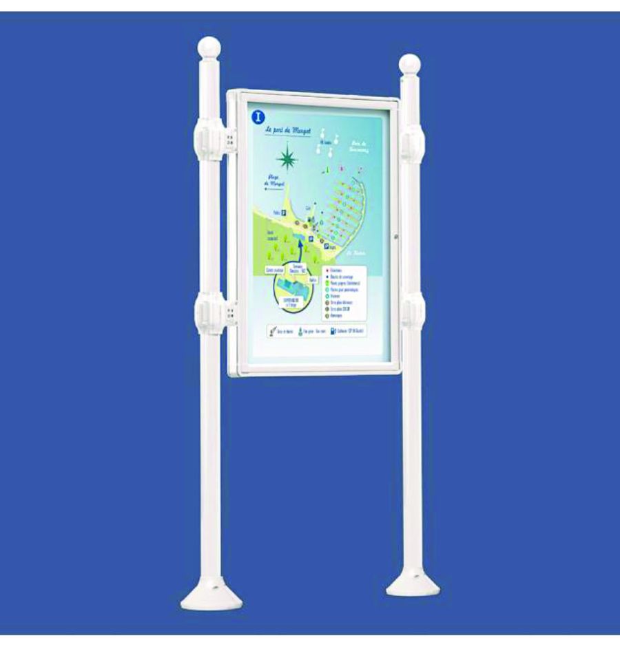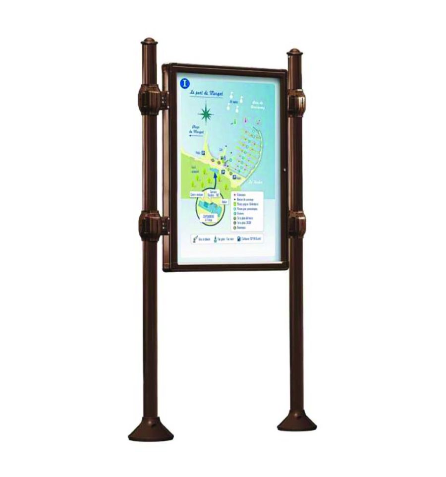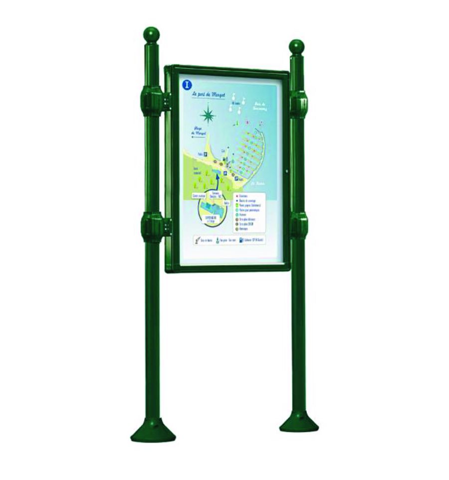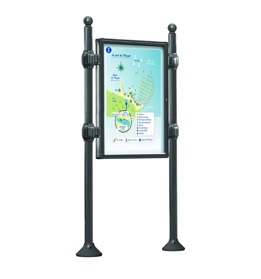 Panneau d'affichage extérieur avec vitrine double-face en aluminium sur poteaux. Disponible dans 2 formats d'affichage au format portrait ou paysage de 12 et 24 feuilles A4 pour afficher sur chaque panneau 24 A4 ou 48 A4.