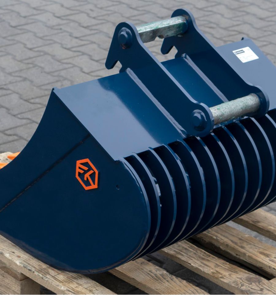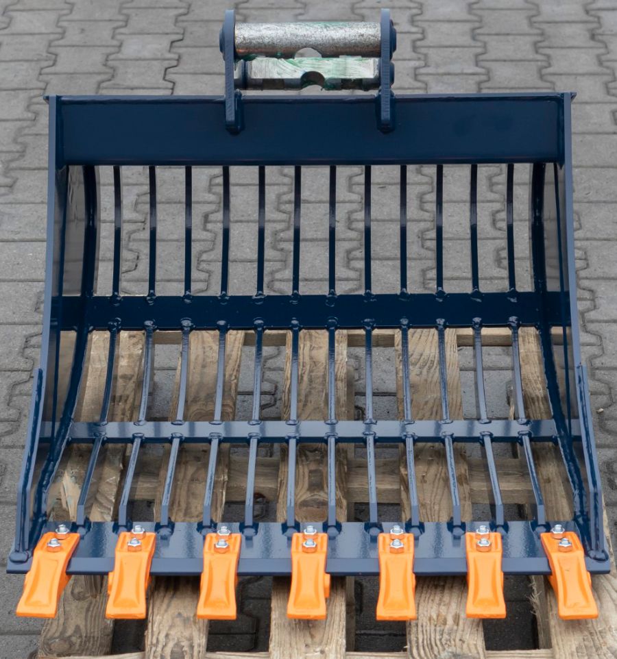 Le godet squelette 5 à 6 tonnes possède des dents de type E11.4/100.3, permettant de percer un sol compact, des surfaces dures à semi-dures ou mêlées à des blocs. Son efficacité pour des travaux de criblage est garantie, même sur de gros volume.