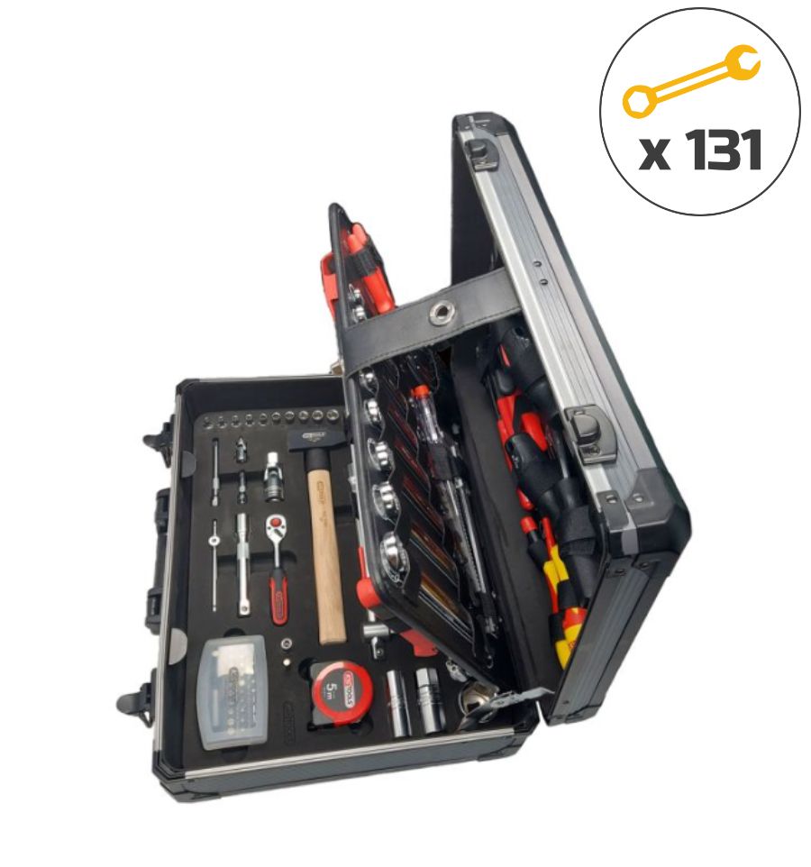 Composée de 131 pièces, vous avez un large choix d'outils entre marteau, cliquet, douille, pied à coulisse, mètre ou encore lampe torche. Retrouvez l'ensemble de la composition détaillée ci-dessous :