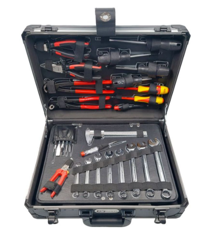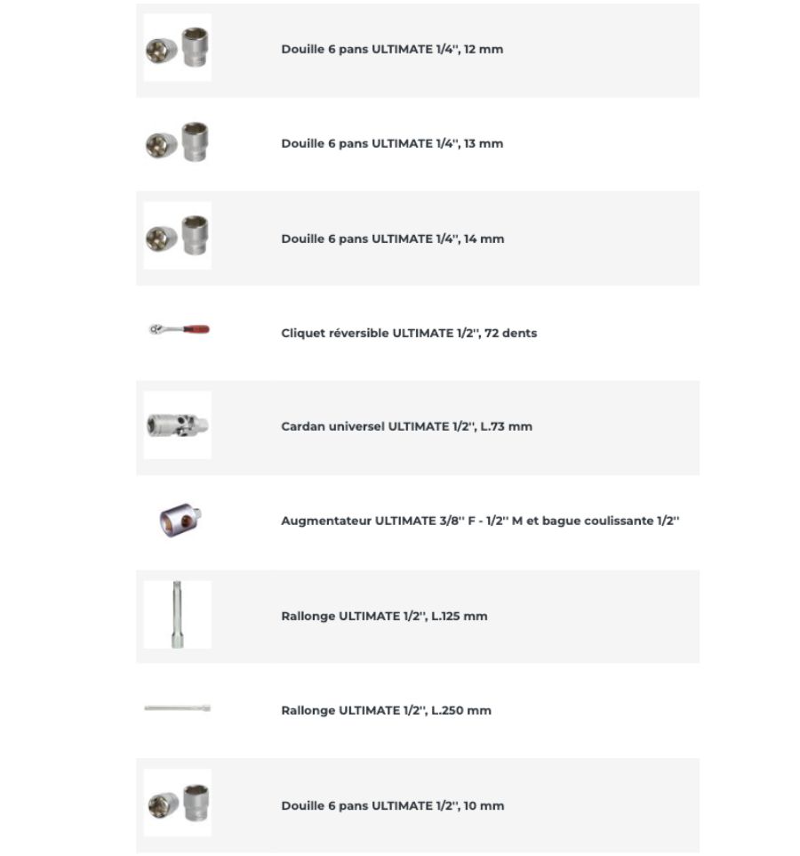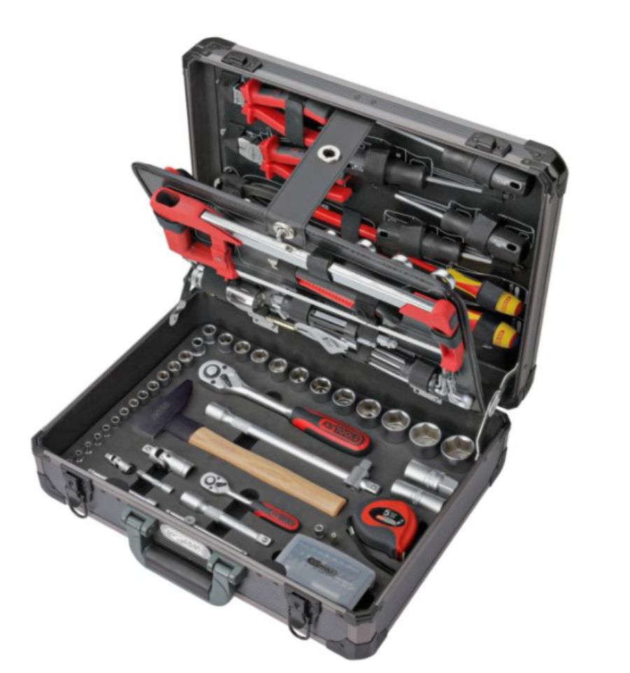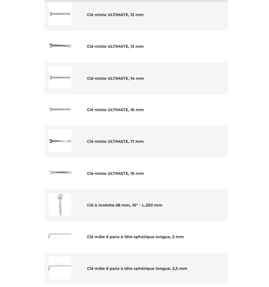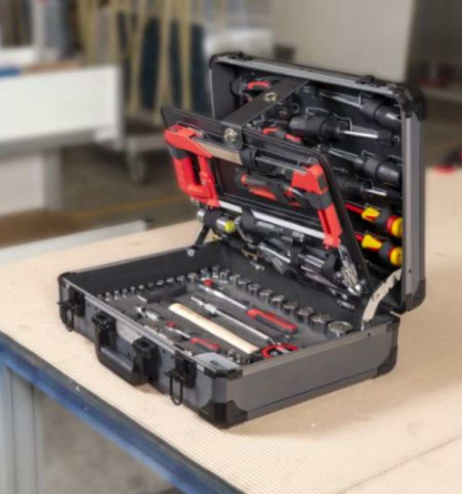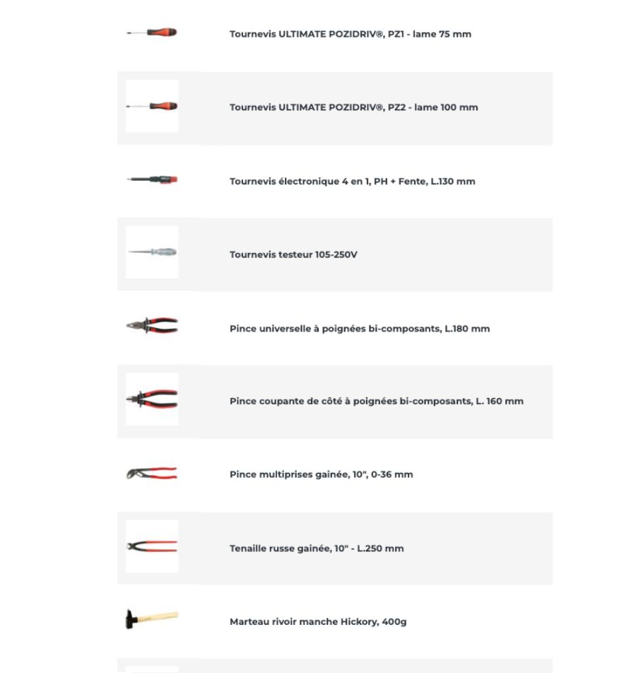 Cliquet, douille, clé mixte, clé mâle, pince, marteau ou encore mètre, sont compris pour vous permettre de réaliser au mieux vos missions.