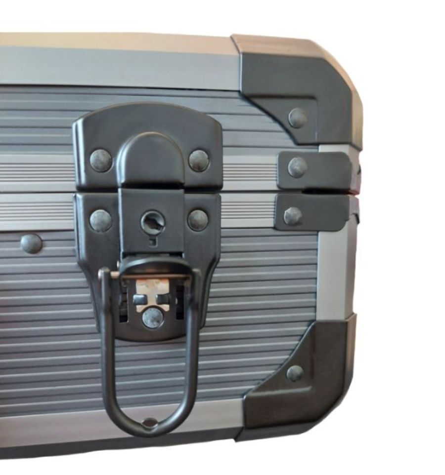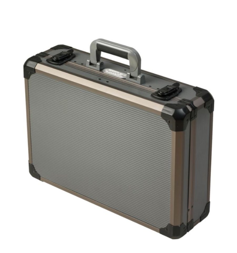 La mallette en aluminium mesure L. 405 x l. 495 x H. 180 mm. Elle pèse 13 kg et offre un aspect chromé satiné.
