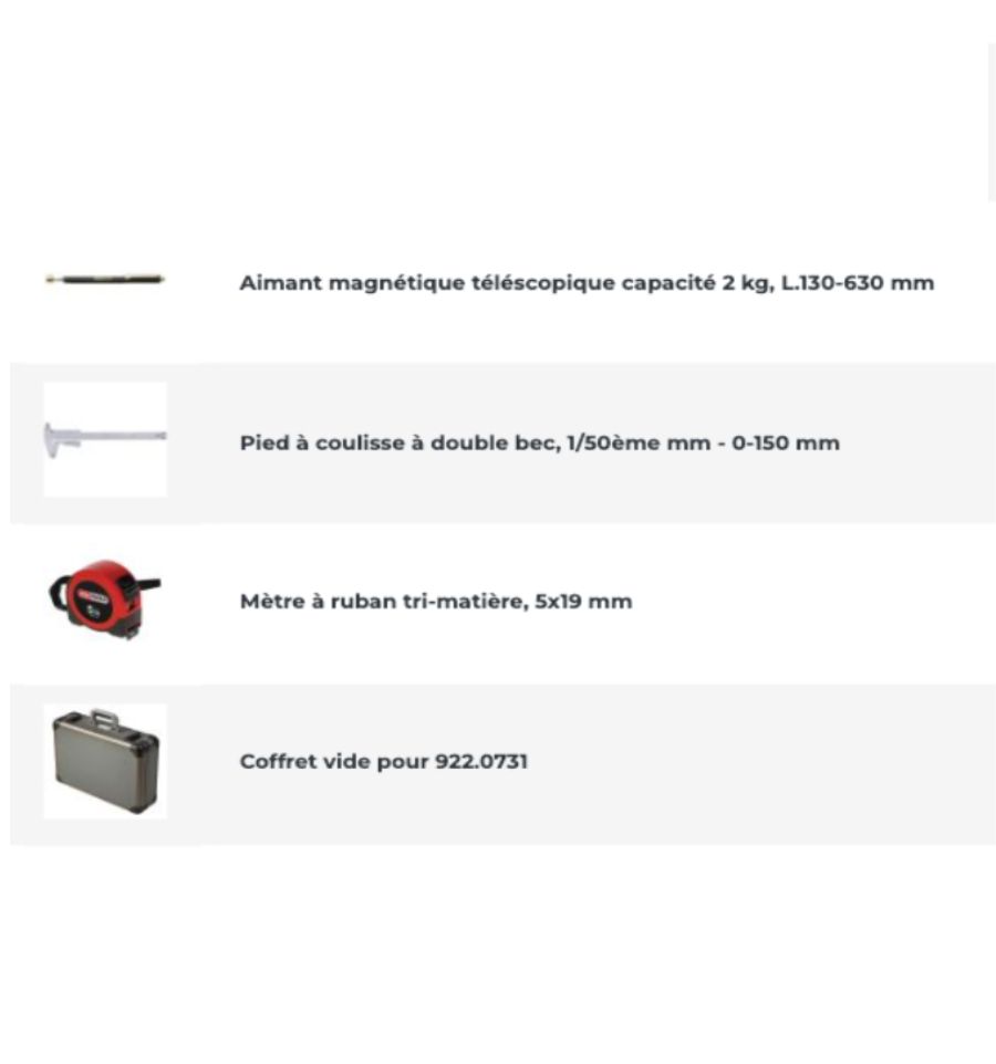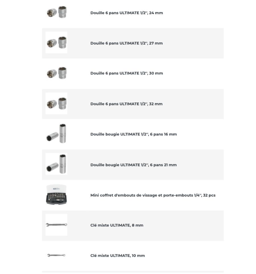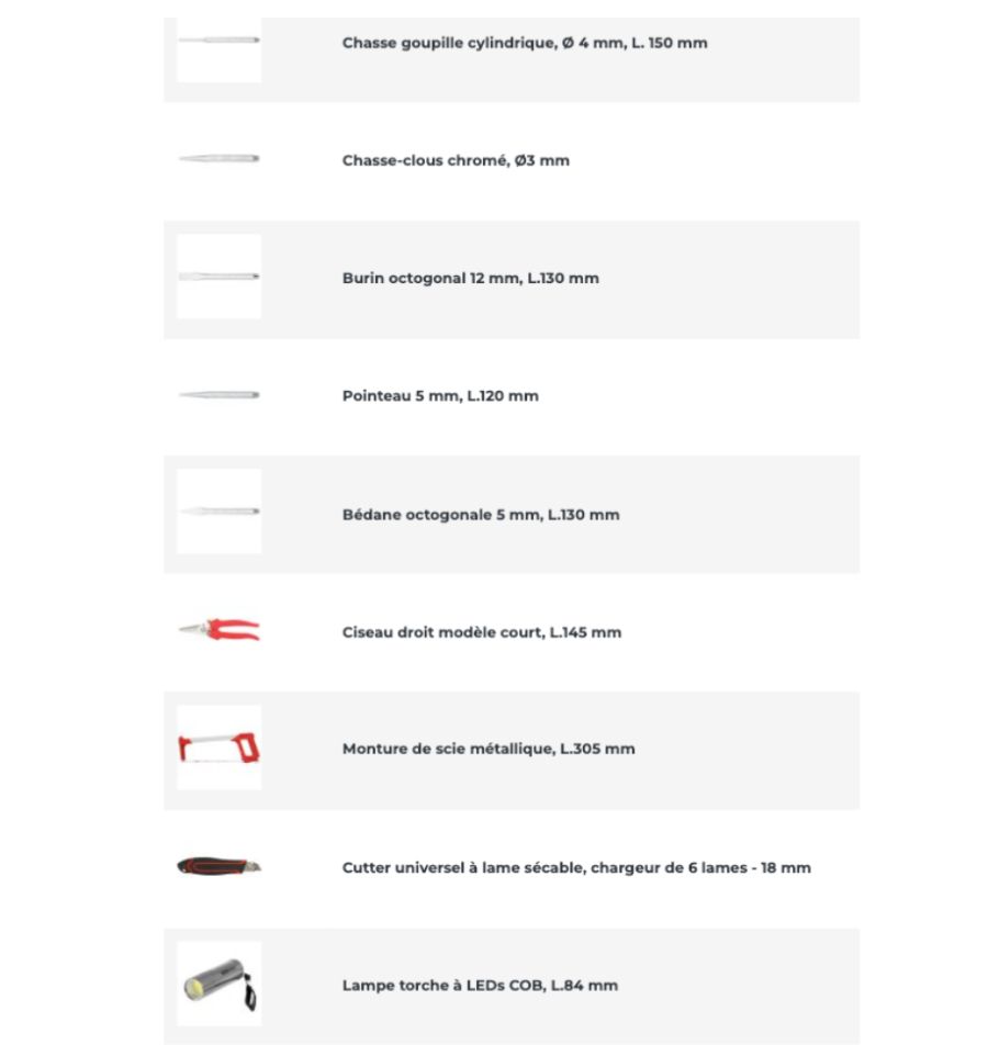 | Autres outils | Marteau / chasse goupille / chasse clous / burin / pointeau / bédane /ciseau droit / monture de scie / Cutter universel / lampe torche LED / aimant magnétique / pied à coulisse / mètre ruban | 13 |