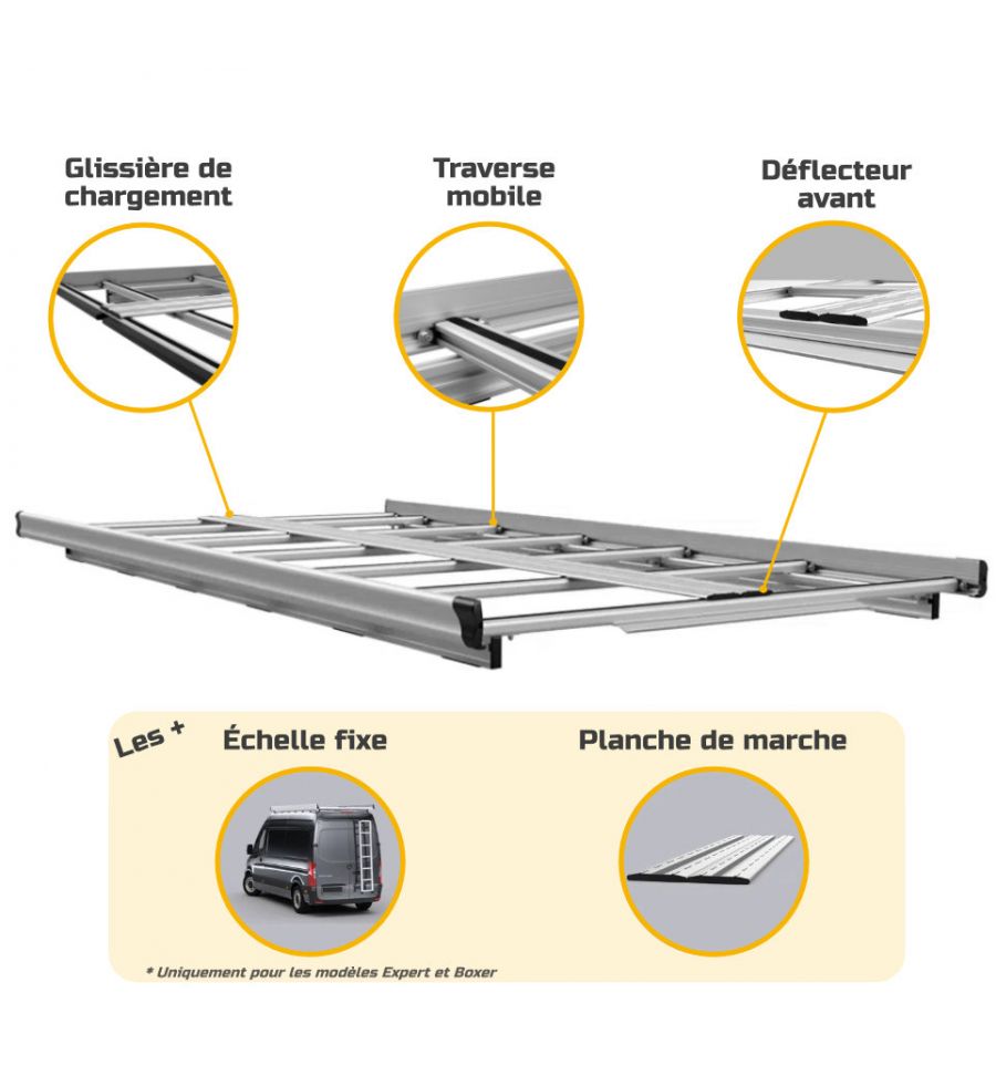 Robuste et légère, elle est compatible avec les Peugeot Partner, Bipper, Boxer et Expert (empattement et hauteur au choix).