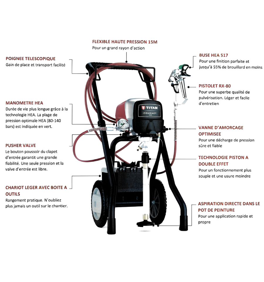 - Un pistolet à peinture avec une buse HEA 517 (jet de 25 cm et une ouverture de 0.017") adaptée aux peintures épaisses par exemple acrylique, latex et glycérophtalique.