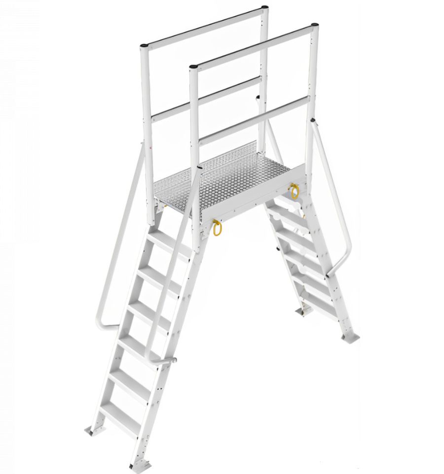 De plus, le saut de loup est équipé de rampes, de garde-corps latéraux et de platines de fixation au sol, assurant une sécurité renforcée sur les chantiers.