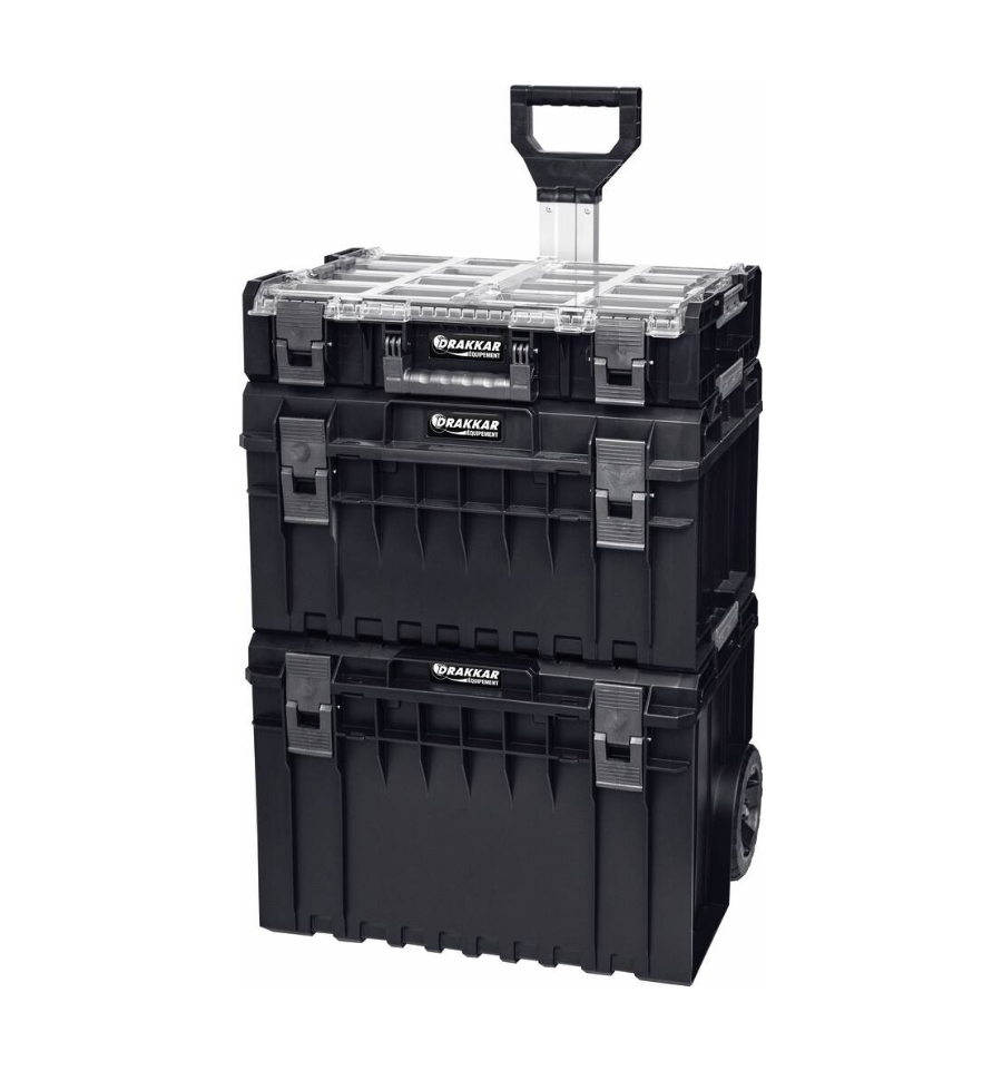 Modèle 3 caisses sur roulettes : modèle complet, avec une base mobile de 50 L, une caisse renforcée de 38 L et une mallette