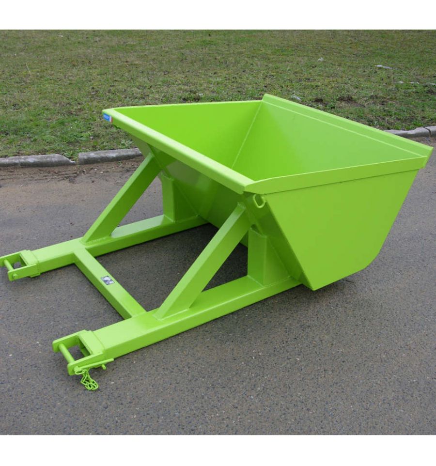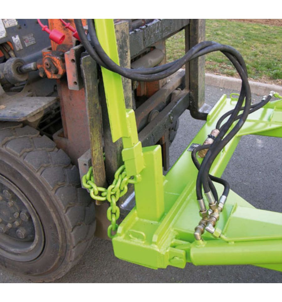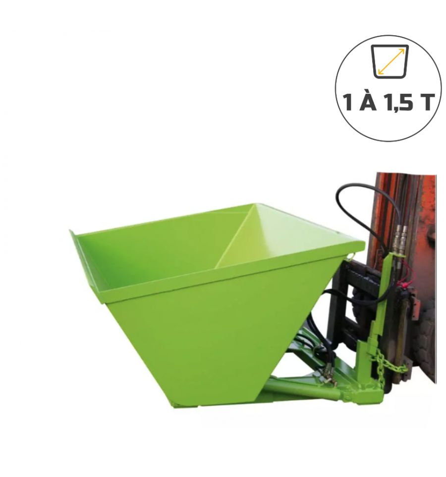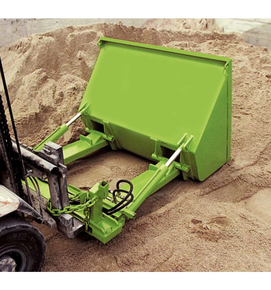 Il détient une lame d'usure biseautée en acier spécial abrasion et un renfort latéral de sa cuve robuste en 5 mm. Sa connexion hydraulique est à raccorder au chariot, celle-ci est montée sur support. De plus, le godet est livré avec une chaîne de maintien au tablier.