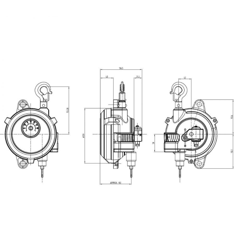 Pour fonctionner correctement, l'équilibreur charge doit être installé en hauteur par l'intermédiaire de son crochet afin de le fixer sur un rail, un portique, une potence, un palan ou un bras articulé.