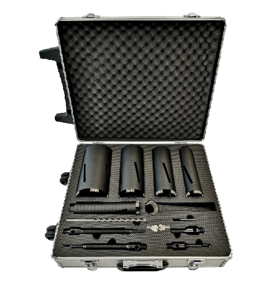 Vous avez la possibilité de choisir entre plusieurs diamètres allant de 32 à 202 mm. Vous pouvez aussi faire le choix du coffret qui inclut tous les outils nécessaires au carottage (5 couronnes, clé plate, foret de centrage, adaptateurs et coffret de rangement en aluminium).