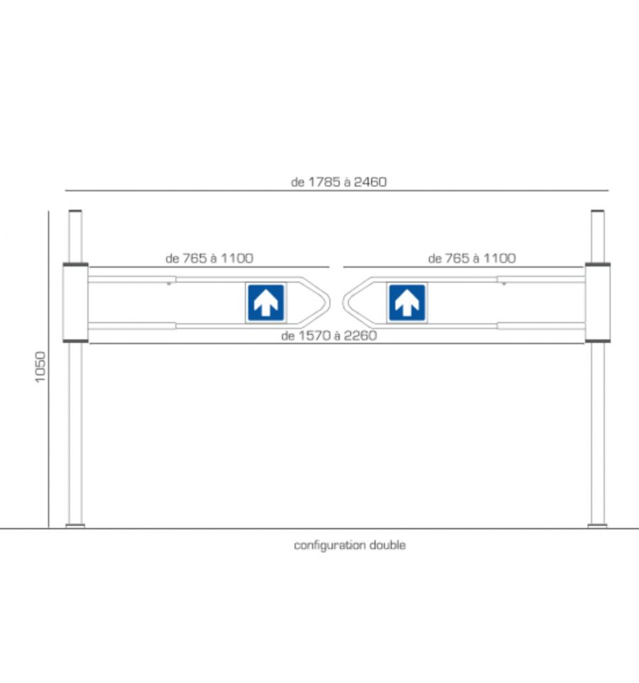 Dans le cadre d'un modèle double : pour obtenir une fermeture synchronisée des portillons, il est nécessaire que la longueur de réglage des bras de portillons soit identique. Ce réglage est aussi à prendre en compte afin que la force de poussée nécessaire à l'ouverture soit semblable pour tous les portillons.