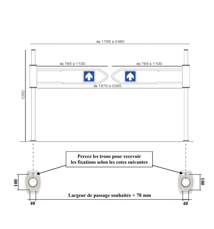 Pour les portillons extensibles, comptez une largeur de passage de + 70 mm.