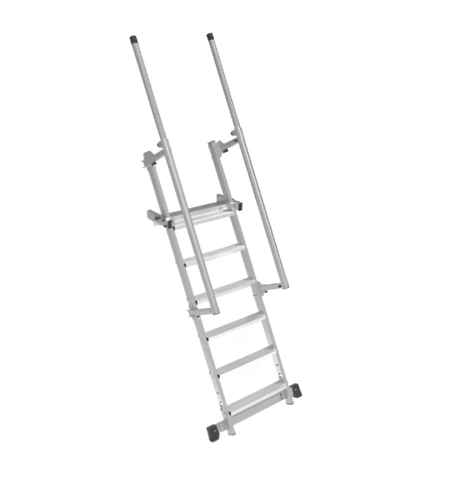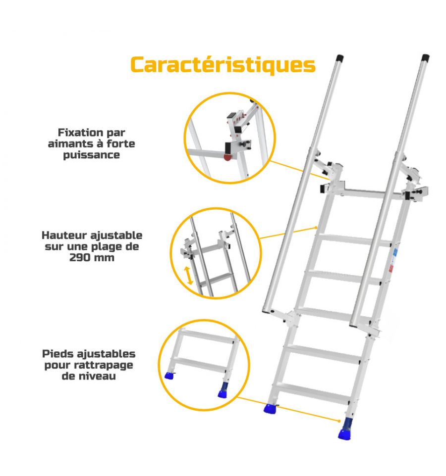 Ce modèle escamotable offre une hauteur ajustable grâce à un double système : d’une part, les pieds de l’échelle sont réglables individuellement, jusqu’à 60 mm de chaque côté, et d’autre part, la structure elle-même permet un ajustement millimétrique de l’appui haut sur la remorque.