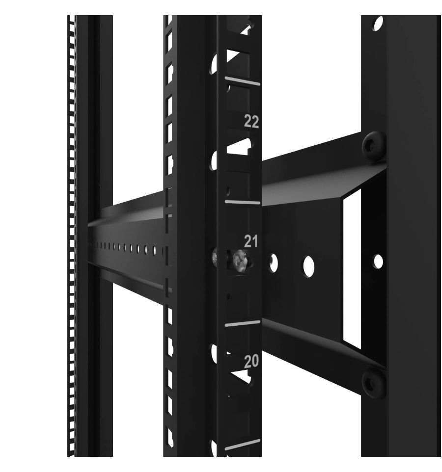 Les quatre montants sont ajustables et sérigraphiés sur toute la profondeur au pas de 20 mm, pour identifier rapidement les différentes unités (U).
