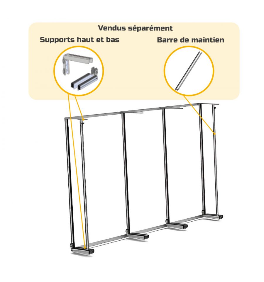 Il constitue la structure de base du pupitre et est modulable selon vos besoins grâce à nos accessoires : ajouter des barres de maintien et des supports haut et bas pour assurer une stabilité et un maintien optimal de vos charges. Les barres de maintien nécessitent obligatoirement un support haut et un support bas pour être installées.