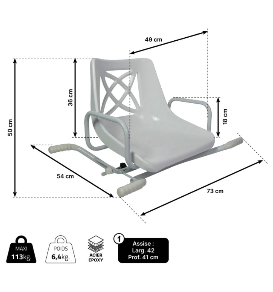 Ce siège s'utilise sur toute baignoire de largeur intérieure entre 54 et 68 cm.