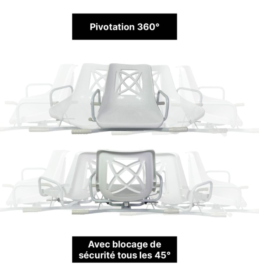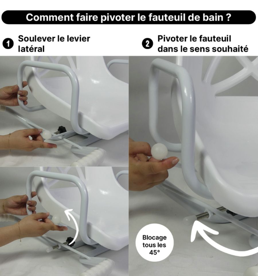 L'utilisateur peut s'asseoir sur le siège et actionner le levier pivotant pour se tourner vers la baignoire. Le siège pivote sur 360° avec un système de blocage tous les 45° assurant plus de sécurité.