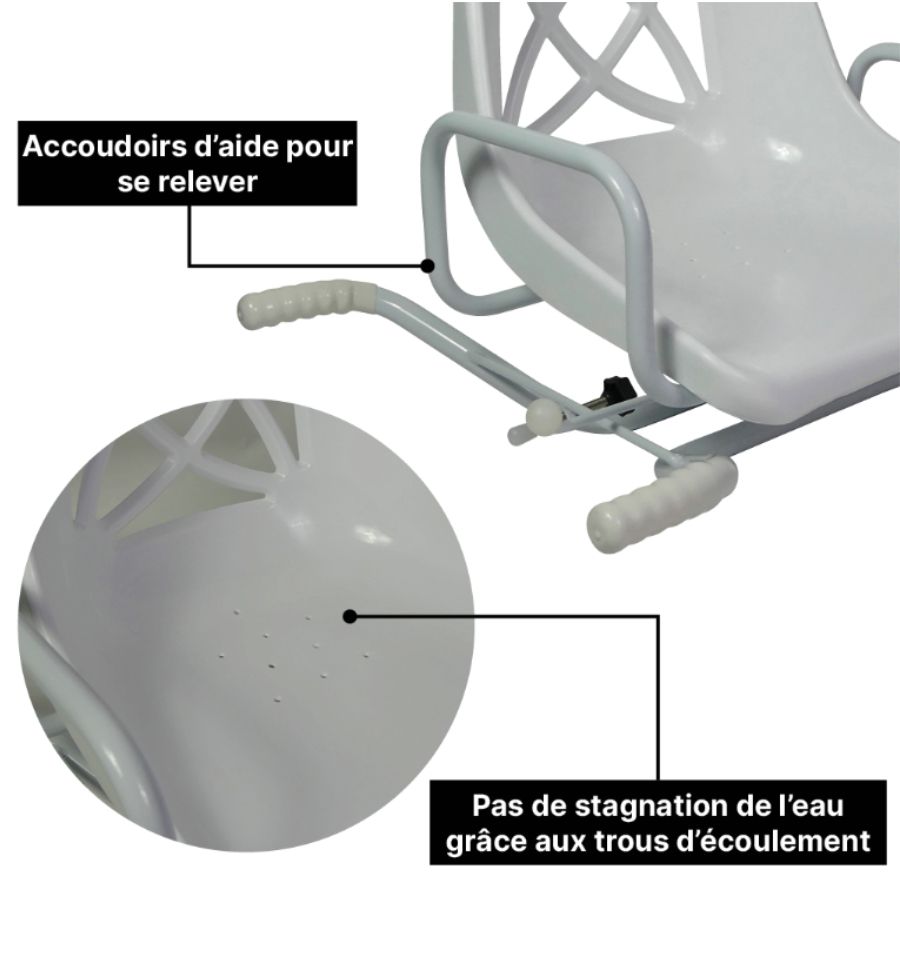 Le fauteuil bain pivotant est conçu en acier, son faible poids de 6,4 kilos facilite son installation pour les professionnels de santé. Afin d'éviter la stagnation d'eau, le siège est muni de trous facilitant l'évacuation.