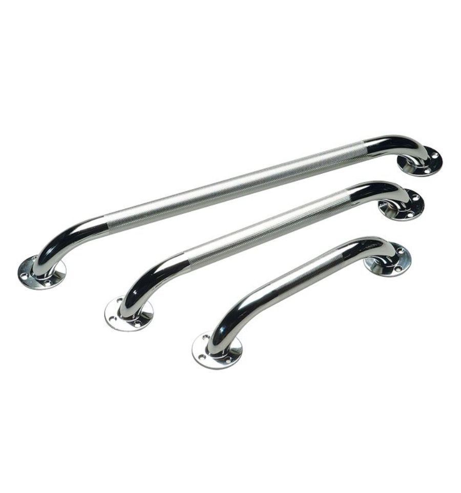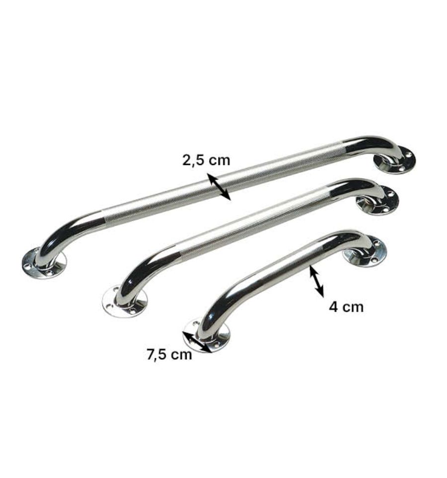 Cette barre d'appui PMR est disponible en 30, 45 ou 60 cm de longueur. Son diamètre est de 2,5 cm. Écartement du mur 4 cm.
