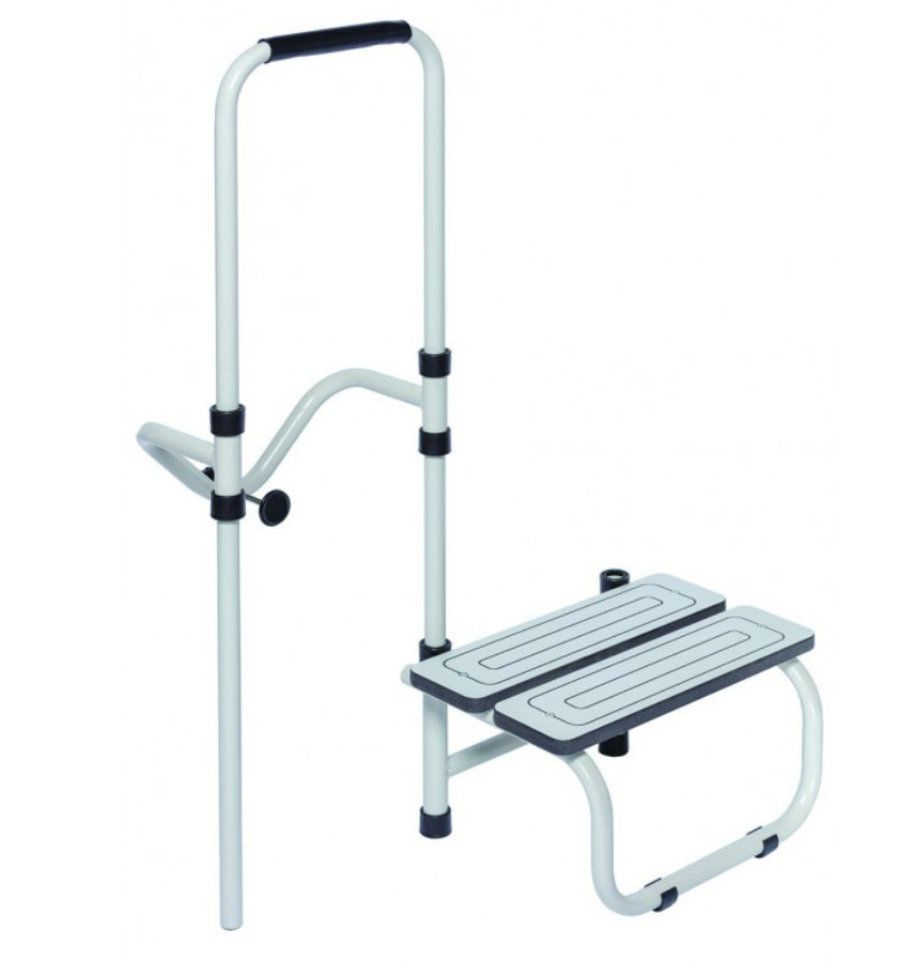 Le marche pied avec barre d'appui permet de gagner en autonomie lors d'un nettoyage corporel. 3 en 1, il stabilise le sénior grâce à sa barre d'appui. Il rehausse le patient du sol pour faciliter l'enjambée et, l'aide pendant sa levée.