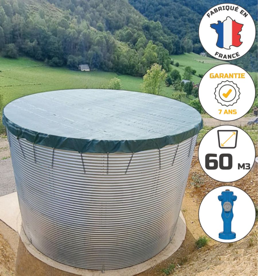 Citerne incendie acier 60 m3 avec liner PVC armé haute résistance. Livrée en kit prêt à monter, il s'agit d'une solution compacte destinée à lutter efficacement contre les incendies.