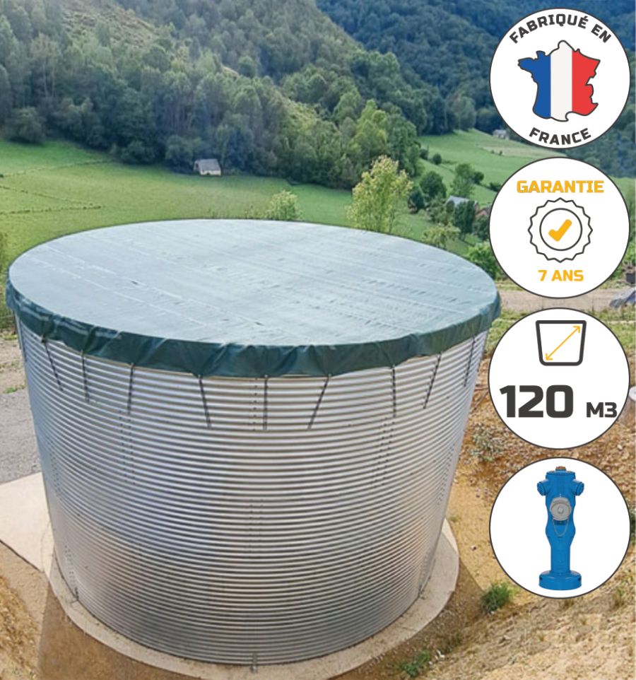 Réserve incendie 120 m3 robuste réalisée en acier galvanisé avec liner PVC armé haute résistance. Solution compacte de lutte contre les incendies qui allie fiabilité, durabilité et respect des exigences DSIS et RNDECI.
