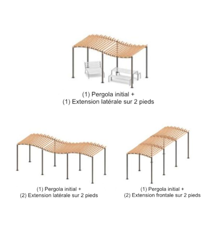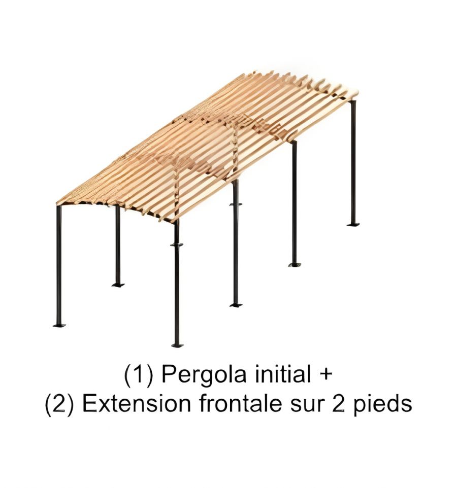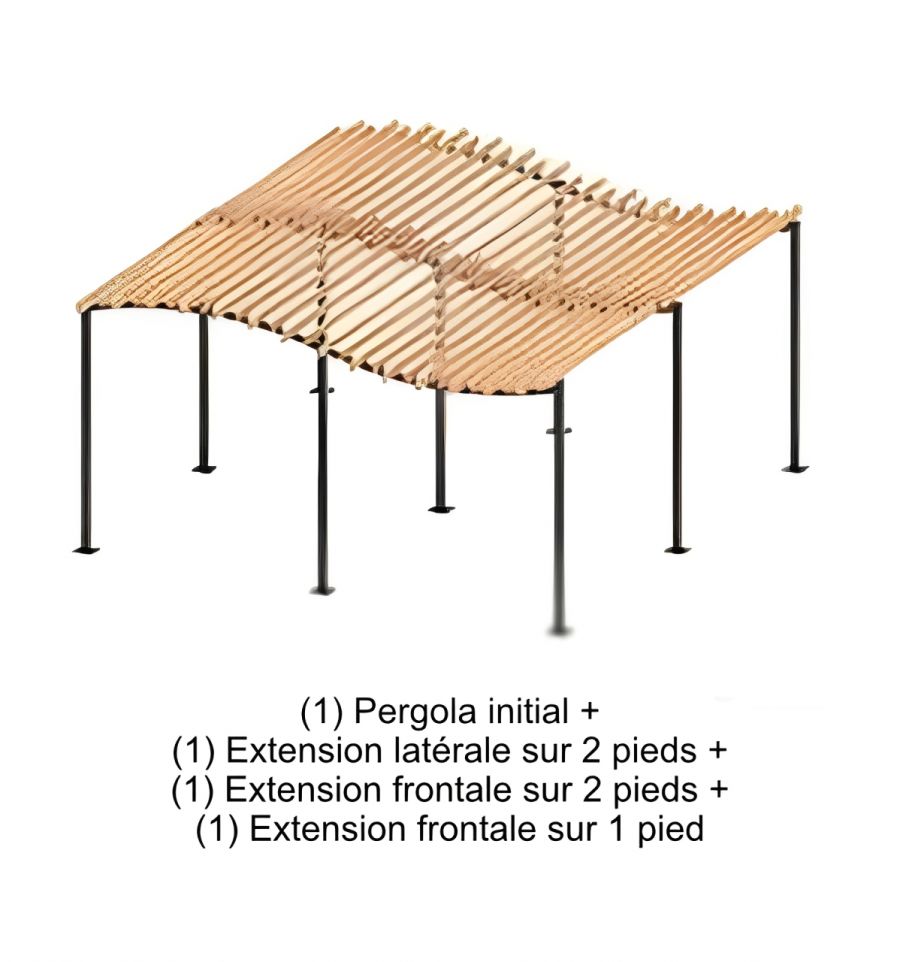 La pergola initiale sur 4 pieds constitue la base de votre aménagement. Elle peut être installée seule ou agrandie à votre convenance avec les 3 extensions (extension latérale sur 2 pieds, extension frontale sur 2 pieds et extension frontale sur 1 pied), selon la surface à couvrir ou l'usage prévu.