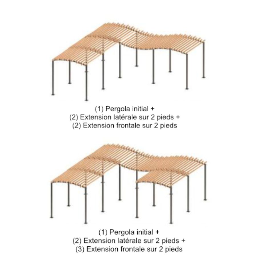 Voici quelques exemples de configurations que vous pouvez réaliser grâce aux extensions à fixer sur la pergola initiale :