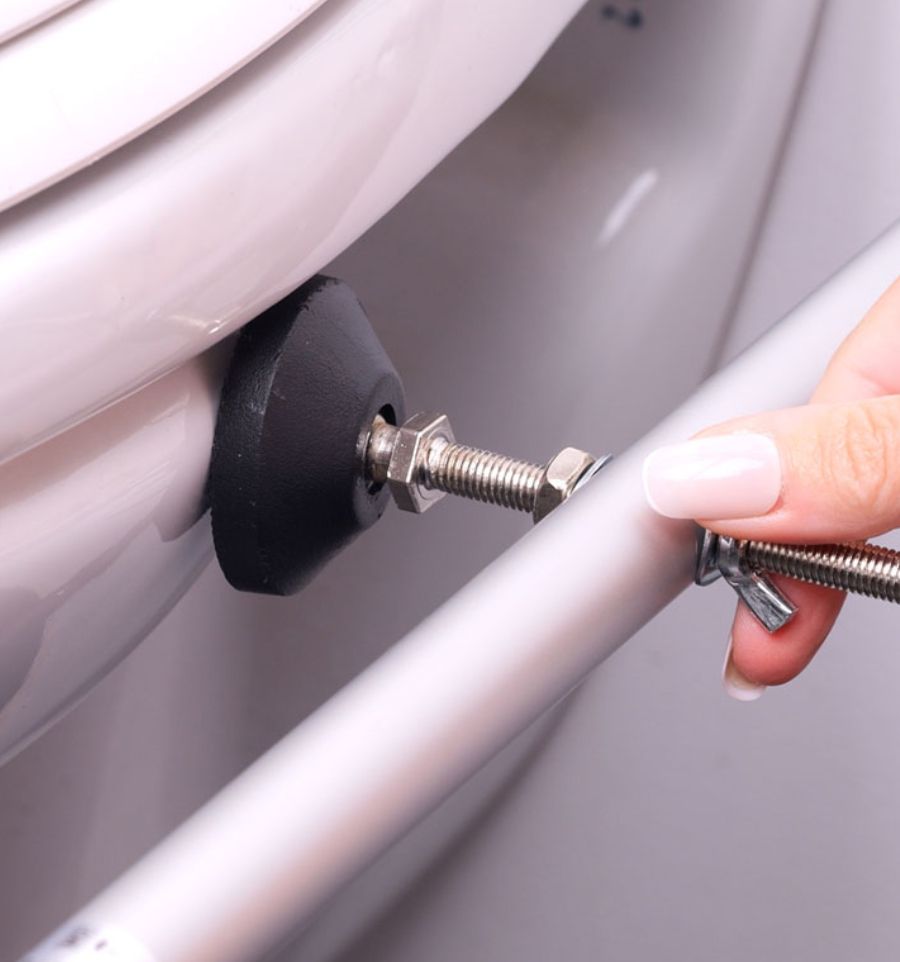 - Placez l’accoudoir wc autour de la cuvette. Insérez le kit de maintien de toilette sur chaque côté.