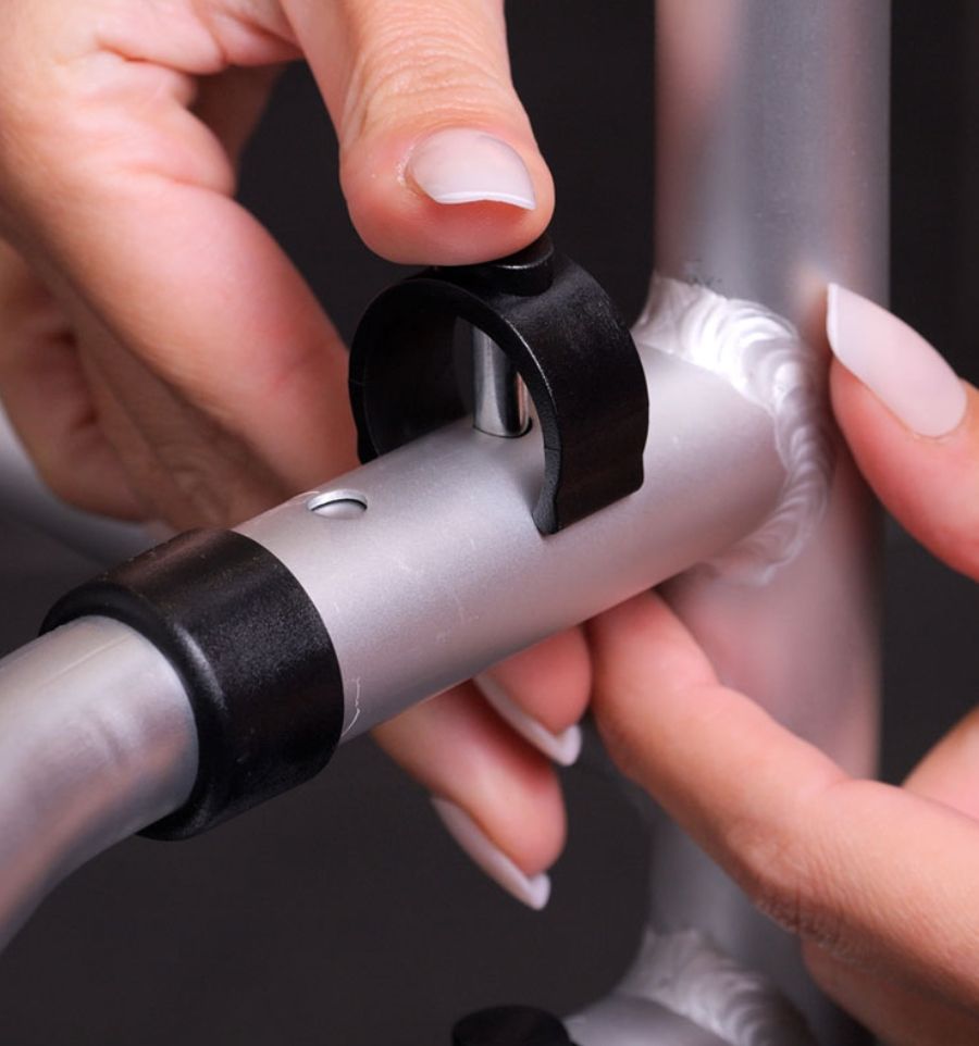 - Assemblez les cadres latéraux à l’aide des deux tubes. Fixez les tubes avec les cadres latéraux à l’aide du clip en forme de « C ». Vous pouvez ajuster la largeur du produit selon votre convenance.