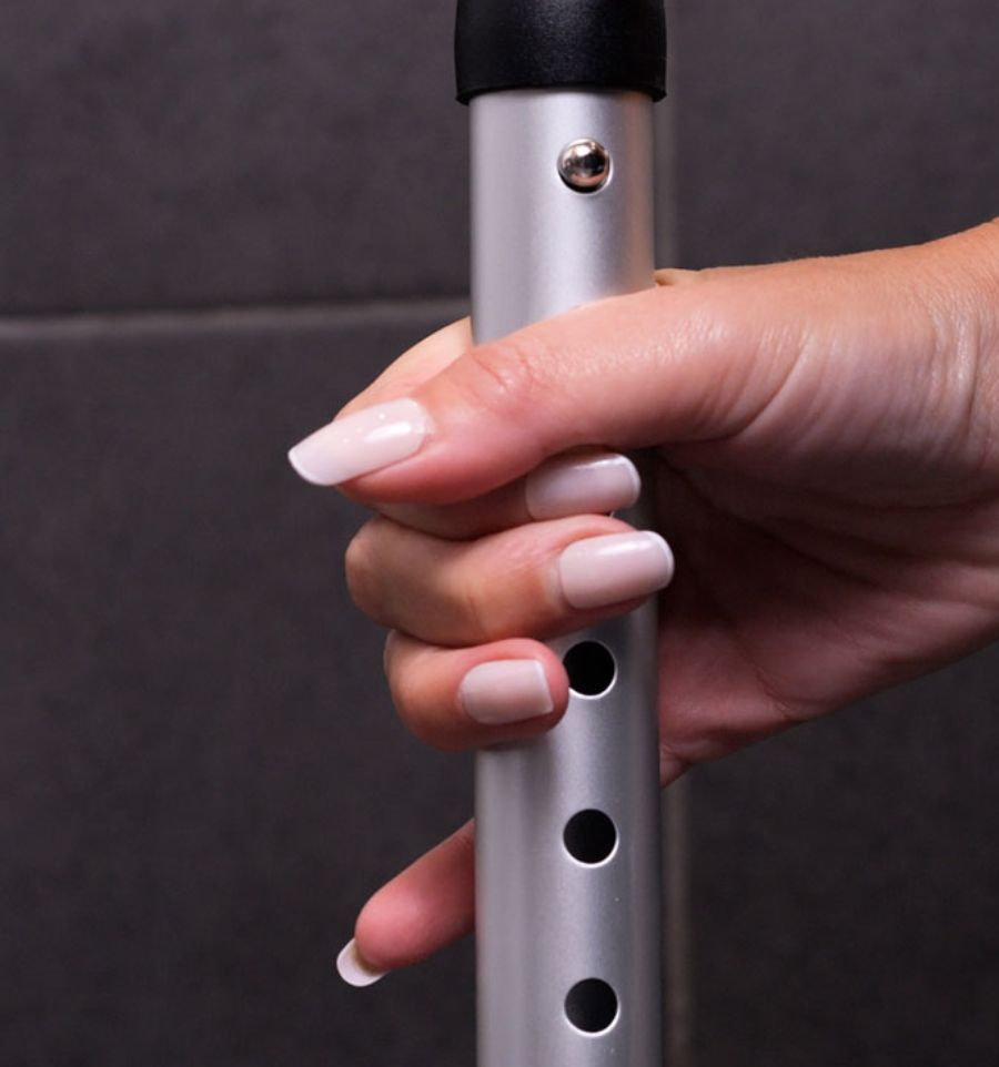 - Alignez la goupille et le trou jusqu’à ce que la goupille ressorte complètement. Ajustez la hauteur des pieds en vous assurant bien que les 4 pieds soient réglés à la même hauteur.