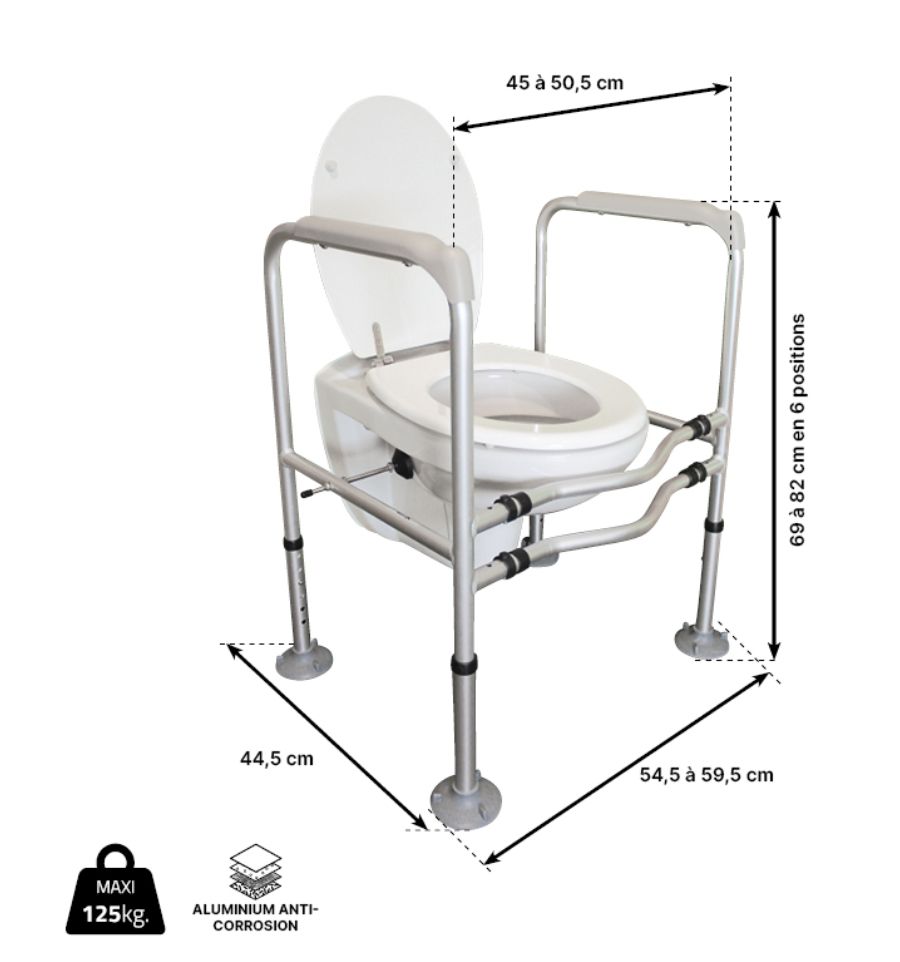 Le cadre de toilettes rehausseur avec accoudoirs mesure L. 54,5/59,5 x l. 44,5 x H. 69/82 centimètres et est réglable en 6 positions.