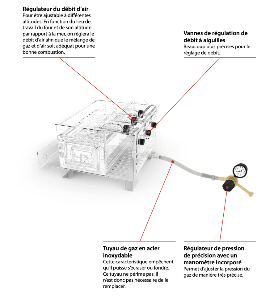 Deux dispositifs de sécurité renforcent la fiabilité du four avec une vanne thermocouple qui coupe automatiquement l'arrivée de gaz si la température chute anormalement, et une vanne anti-retour qui empêche tout reflux de gaz vers la bouteille.