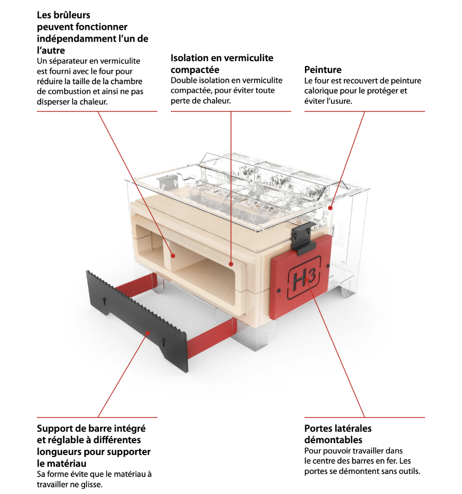 Ce four de forge est équipé d'un, deux ou trois brûleurs afin de chauffer et travailler le fer.
