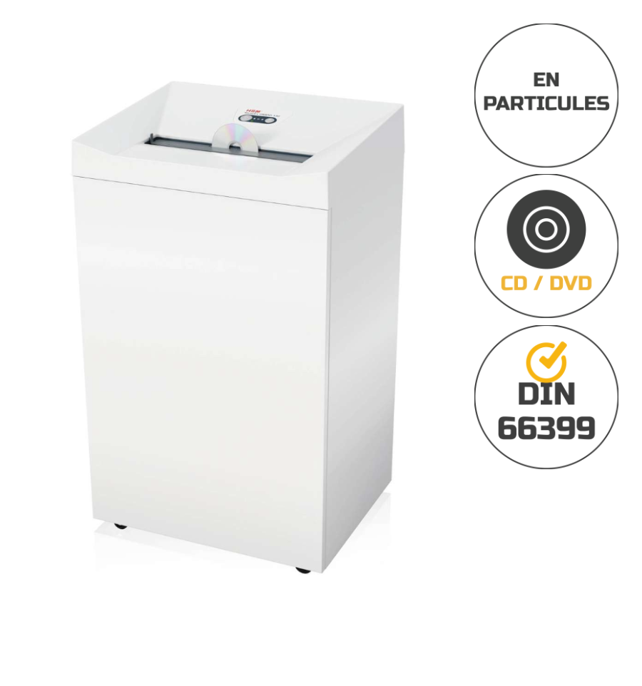 Ce destructeur détruit les CD, DVD ainsi que les cartes de crédit. Il répond aux normes de sécurité, notamment la norme DIN 66399 avec des niveaux de protection E-5 / O-5 / T-6, assurant un niveau de confidentialité élevée, adapté aux données sensibles.