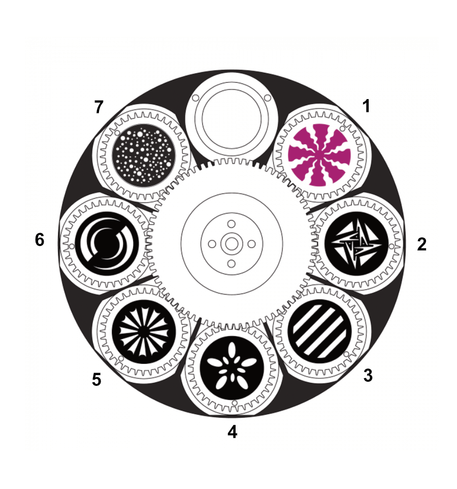 Équipée de 7 gobos (6 fixes en métal et 1 rotatif en verre), elle offre une grande variété d'effets de lumière, créant différents styles et ambiances. Ces 2 prismes (1 linéaire 5 facettes et 1 circulaire 6 facettes) vous permettent de donner de la profondeur et du volume au faisceau lumineux.