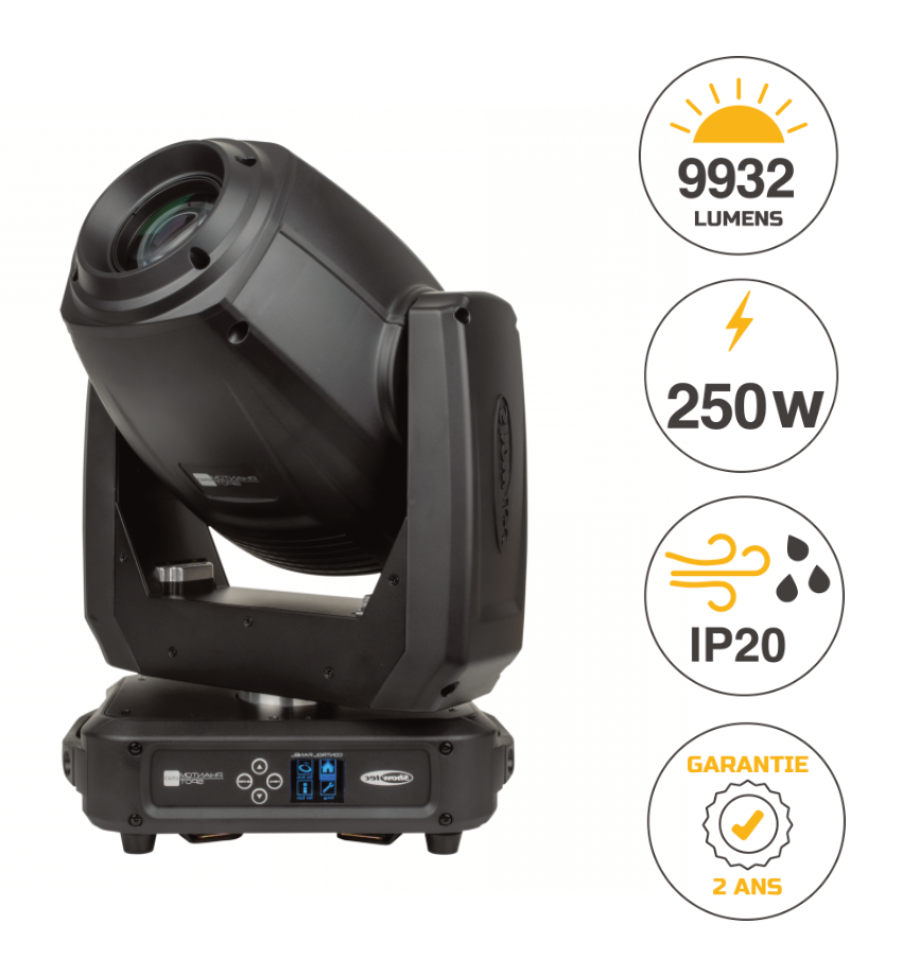 La lyre spot 250 W convient parfaitement à l'éclairage de concert et de spectacle en intérieur.