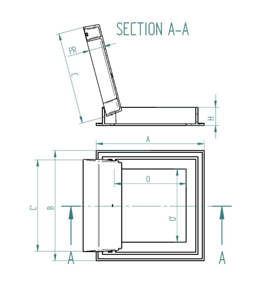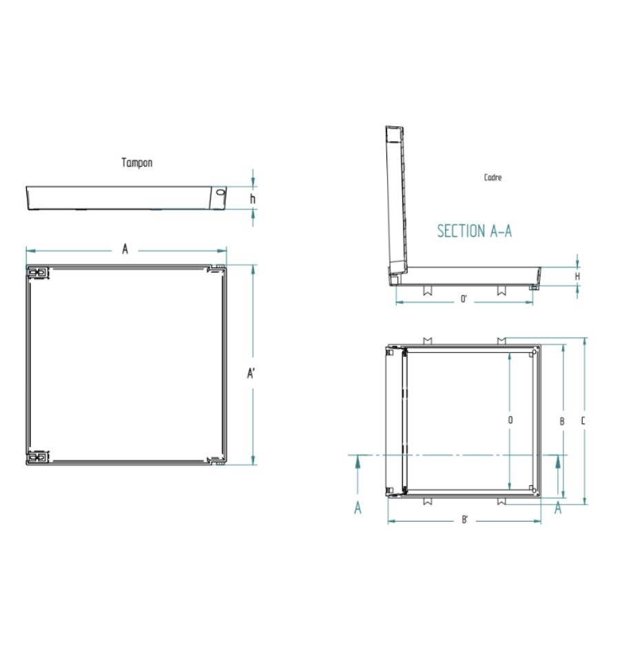 | Largeur (A) | Largeur du cadre avec fixation (C) | Longueur (B) | Épaisseur du tampon (h) | Hauteur du cadre (H) | Ouverture (O x O') | Profondeur (PR) | |