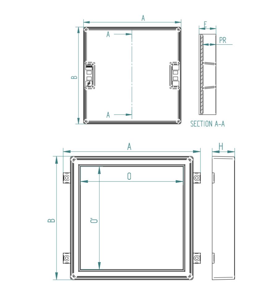 | Largeur (A) | Longueur (B) | Hauteur du cadre (H) | Ouverture (O x O') | Profondeur (PR) | |