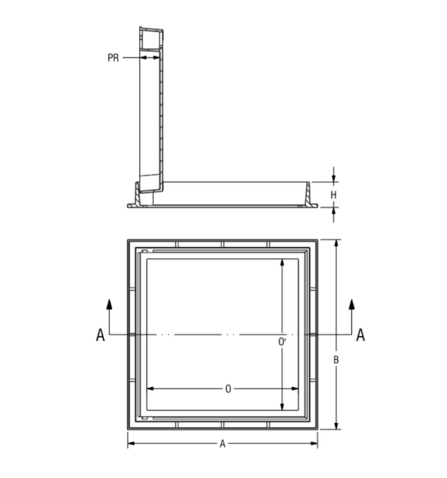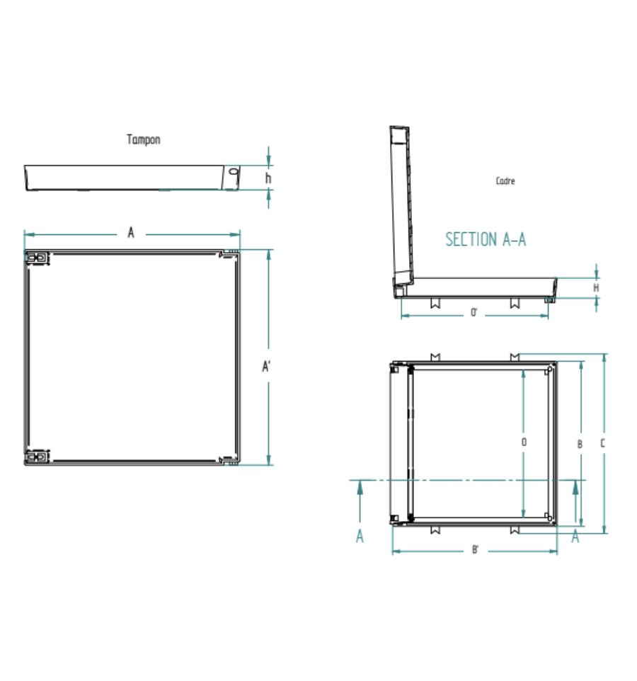 | Largeur (A) | Largeur du cadre avec fixation (C) | Longueur (B) | Épaisseur du tampon (h) | Hauteur du cadre (H) | Ouverture (O x O') | Profondeur (PR) | |