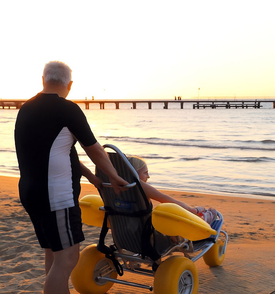 Il peut être utilisé à la piscine comme à la plage. Ses roues imposantes lui permettent de se déplacer sans difficulté dans les sols meubles. Ses accoudoirs et pneus flottants lui garantissent une parfaite flottabilité dans les eaux calmes. Il est important de noter que le fauteuil de baignade nécessite l'aide d'un accompagnateur pour la mise à l'eau et la baignade.
