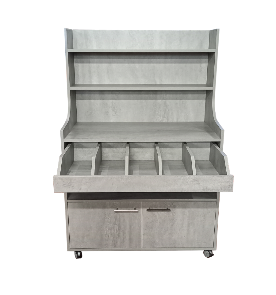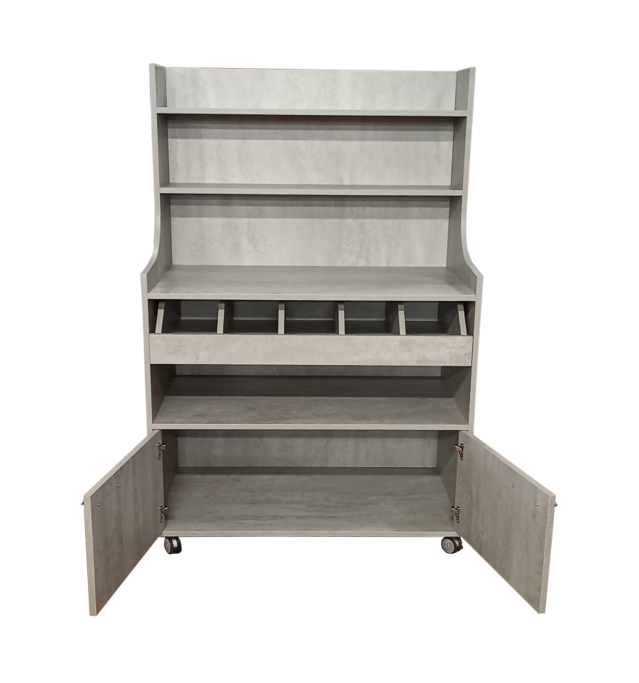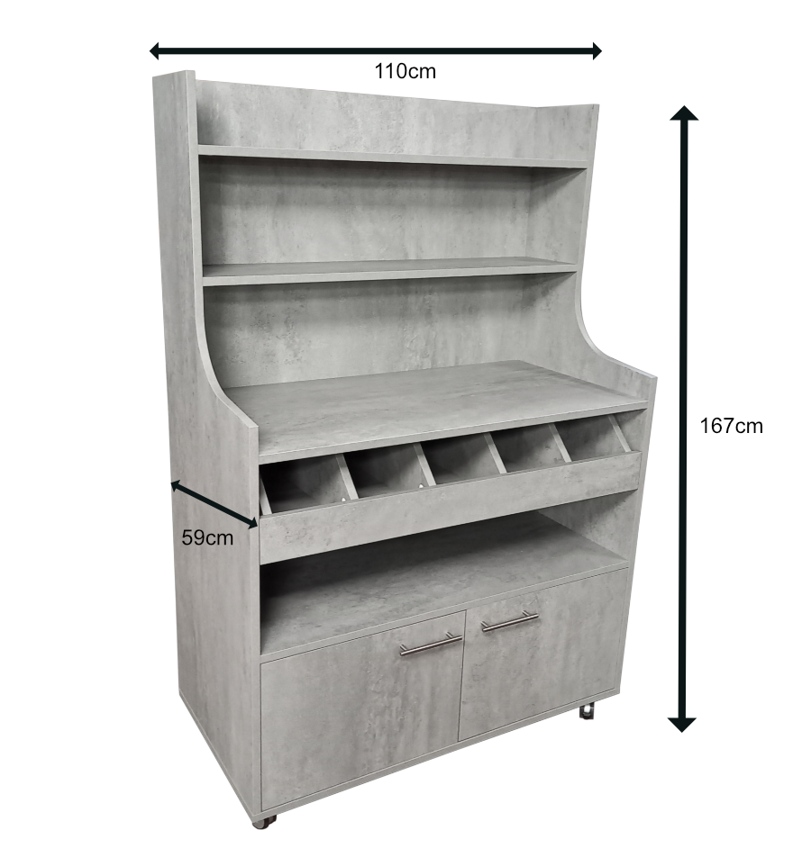 Cette desserte vaisselier dispose d'une niche ouverte, d'une niche fermée par 2 portes, ainsi qu'un tiroir à couverts compartimenté en 5 sections.