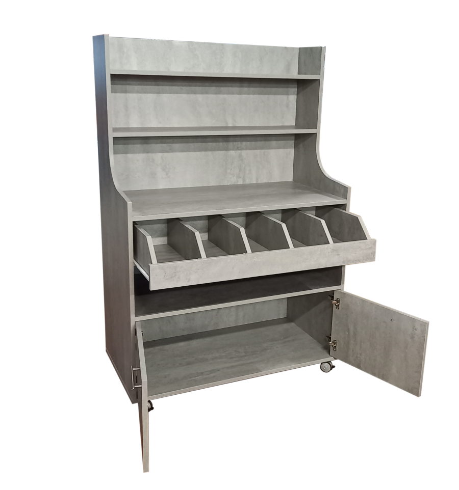 Elle offre un espace de rangement pratique avec une niche fermée par 2 portes, une niche ouverte ainsi qu'un tiroir à couverts de 5 compartiments. Deux tablettes fixes en hauteur permettent également d'organiser et de disposer facilement votre matériel.