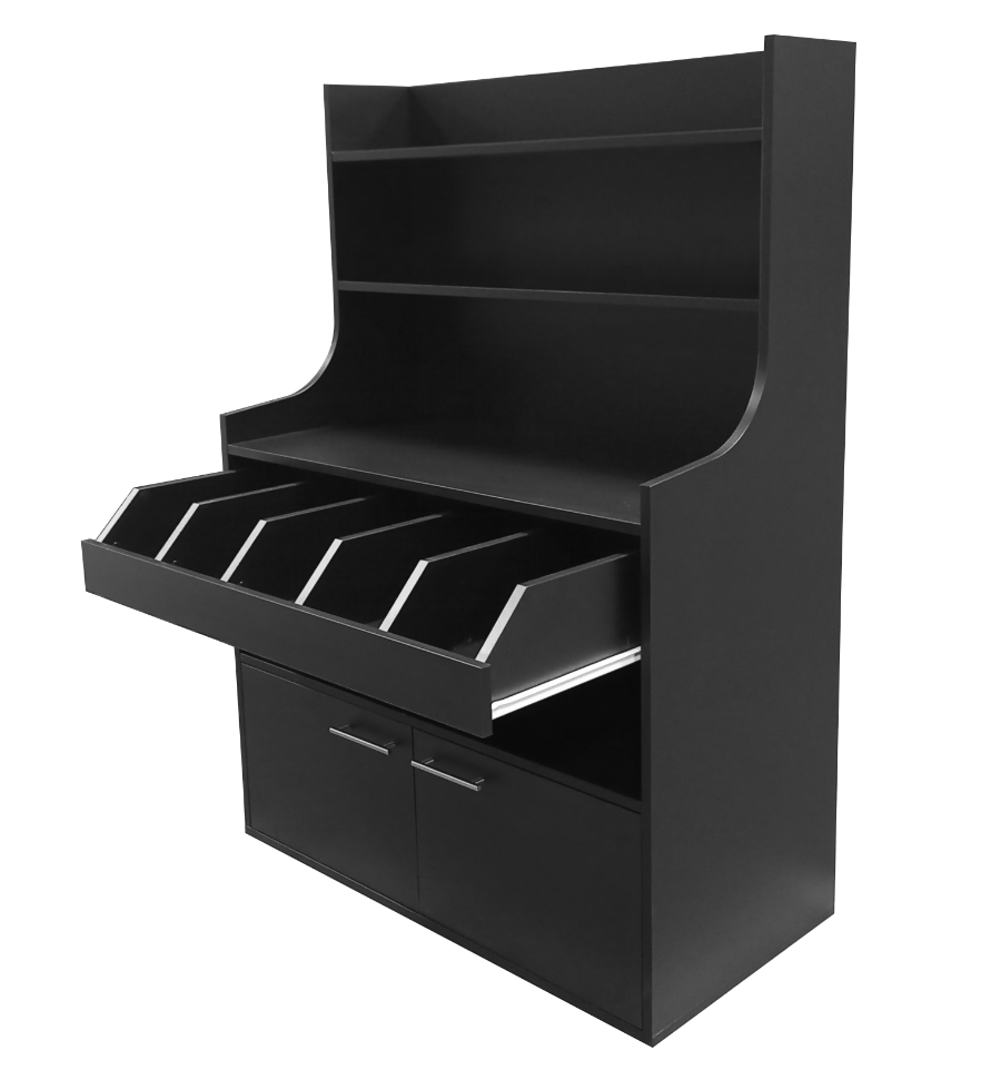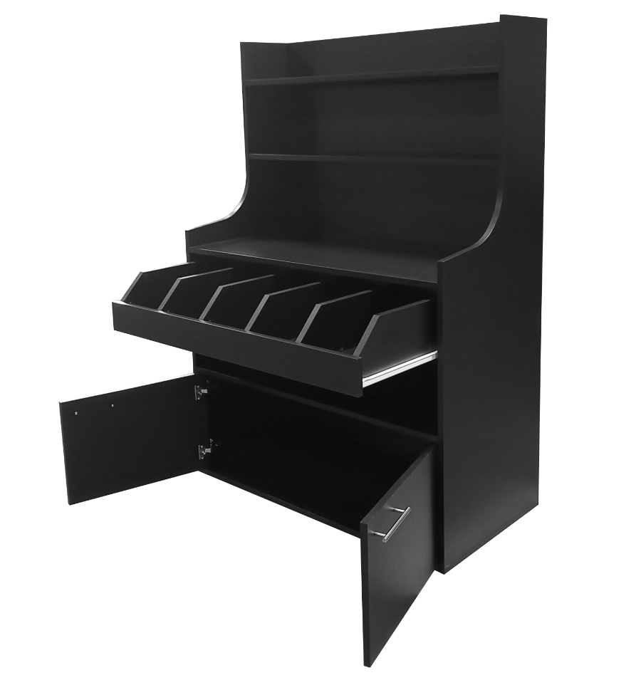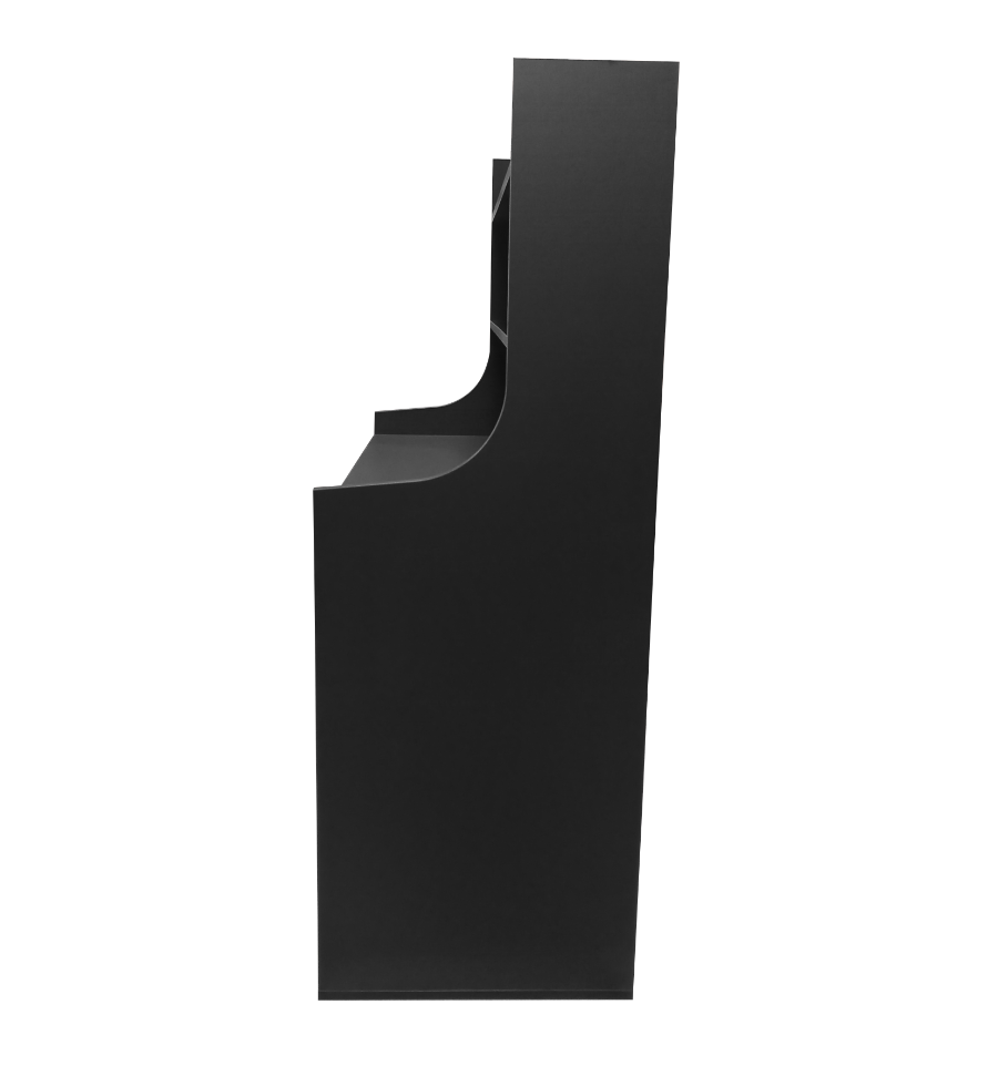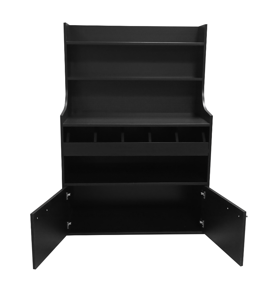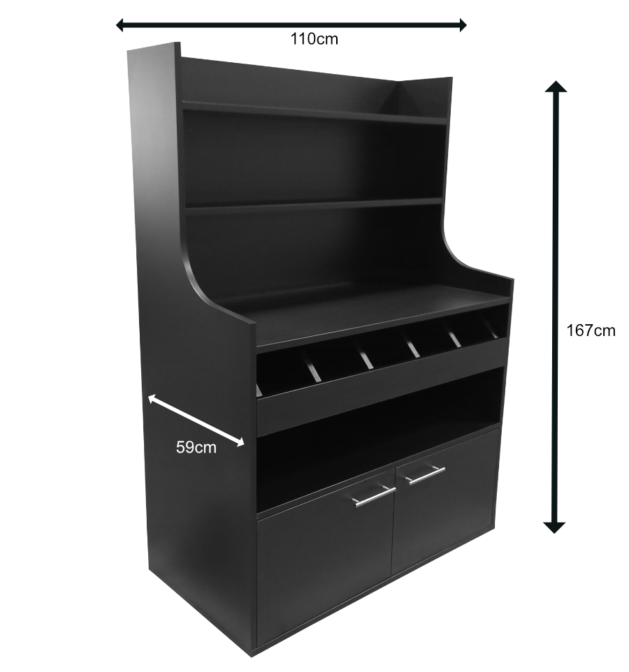 En partie haute, 2 étagères fixes supplémentaires permettent de stocker ou d'exposer différents équipements, optimisant ainsi la place de cette dernière.