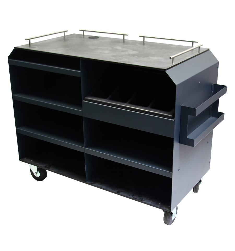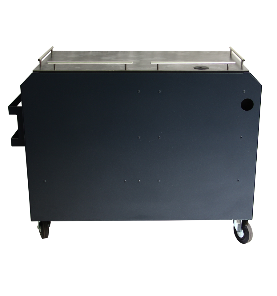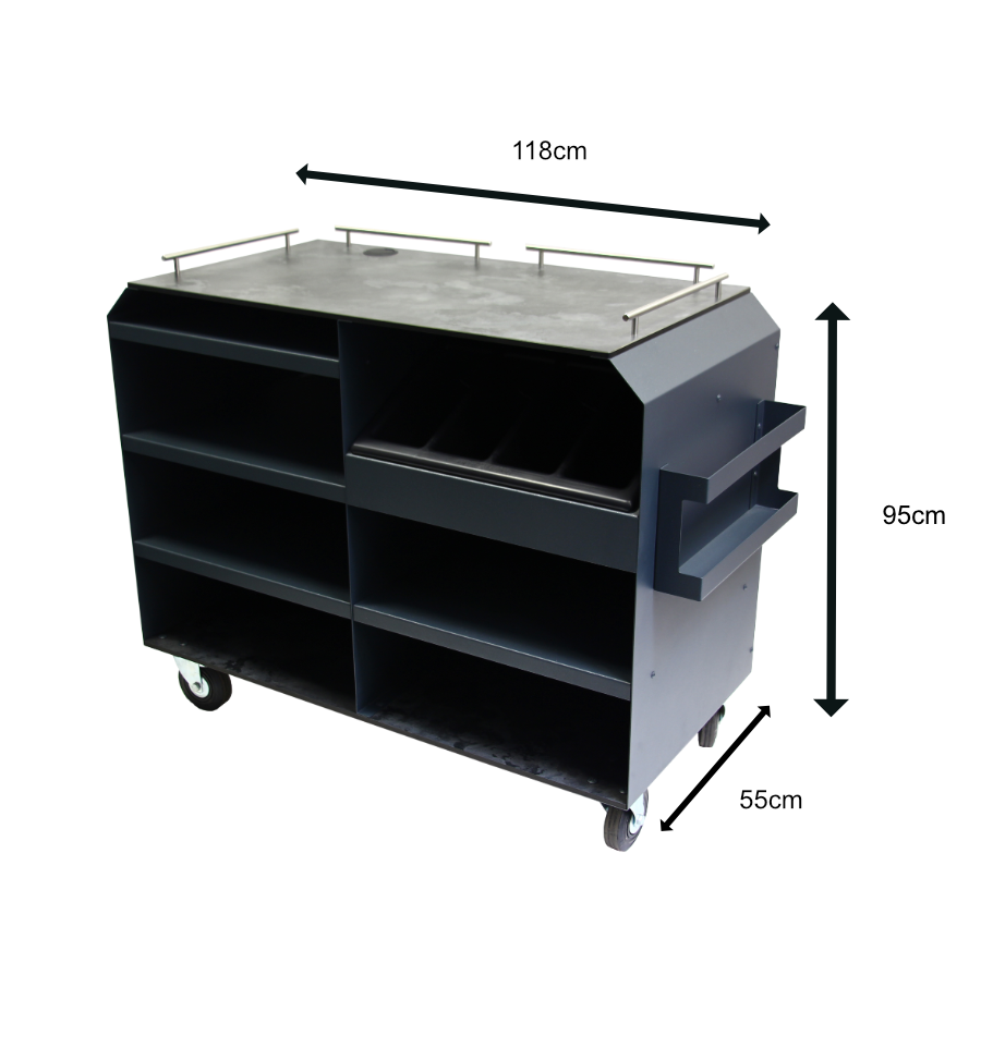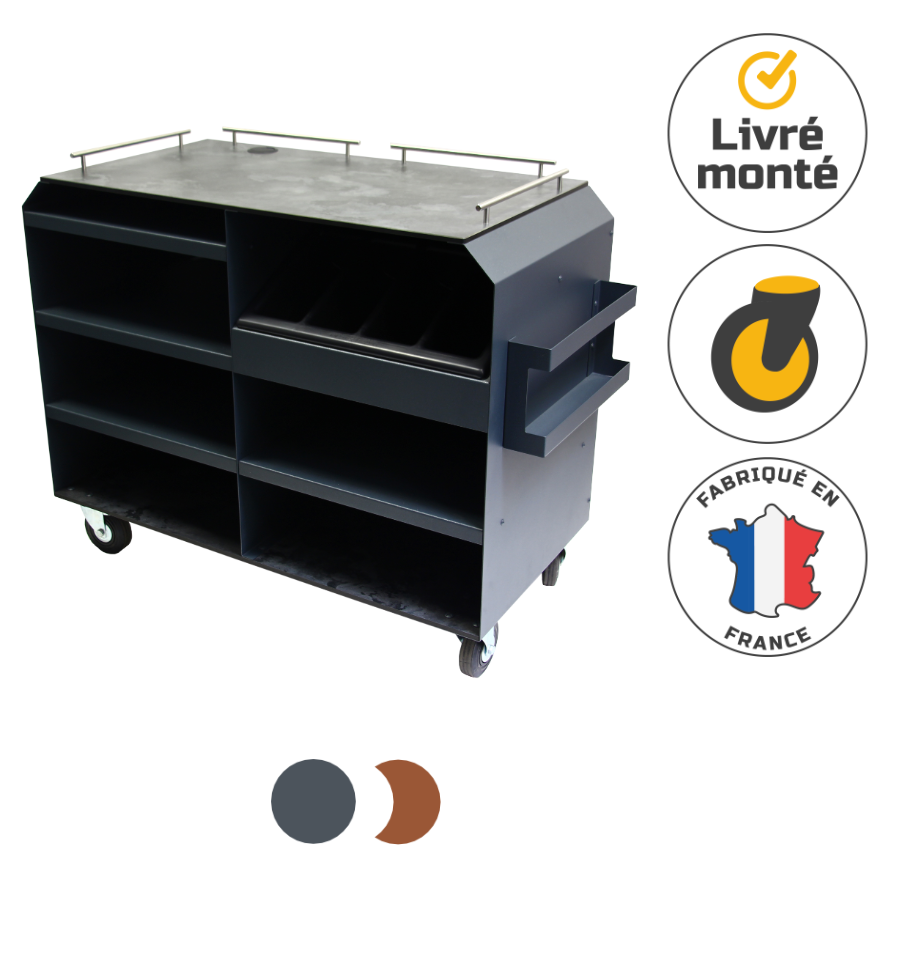Cette desserte professionnelle est fabriquée avec une structure en acier 15/100ᵉ à finition thermolaquée, garantissant résistance et durabilité, même en extérieur.