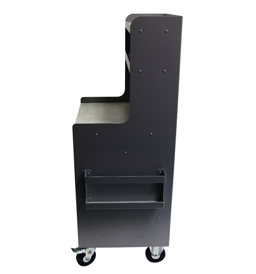 La desserte est réalisée en acier d'une épaisseur de 0,15 mm (15/100ᵉ), avec une finition thermolaquée qui lui confère à la fois résistance aux chocs, protection contre la corrosion et une esthétique soignée.