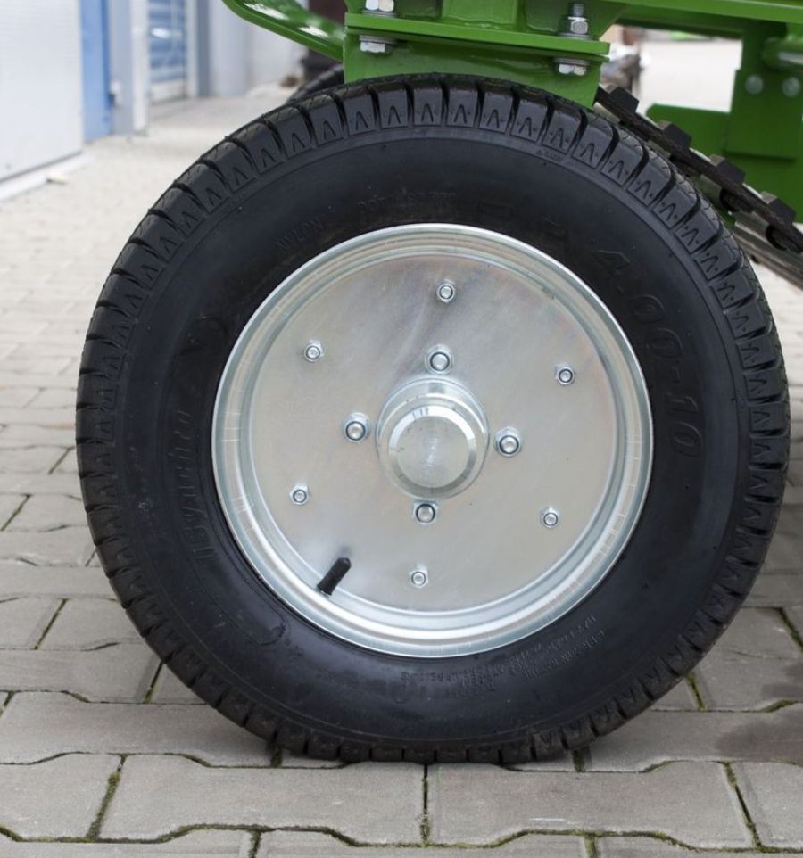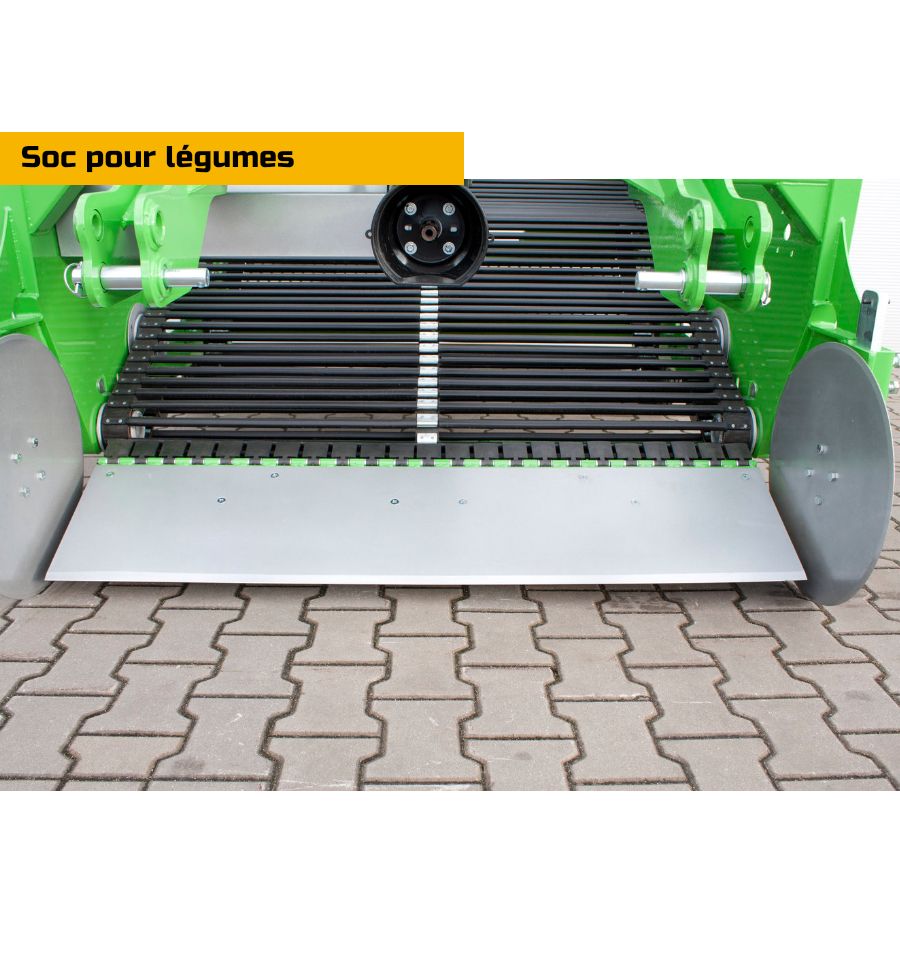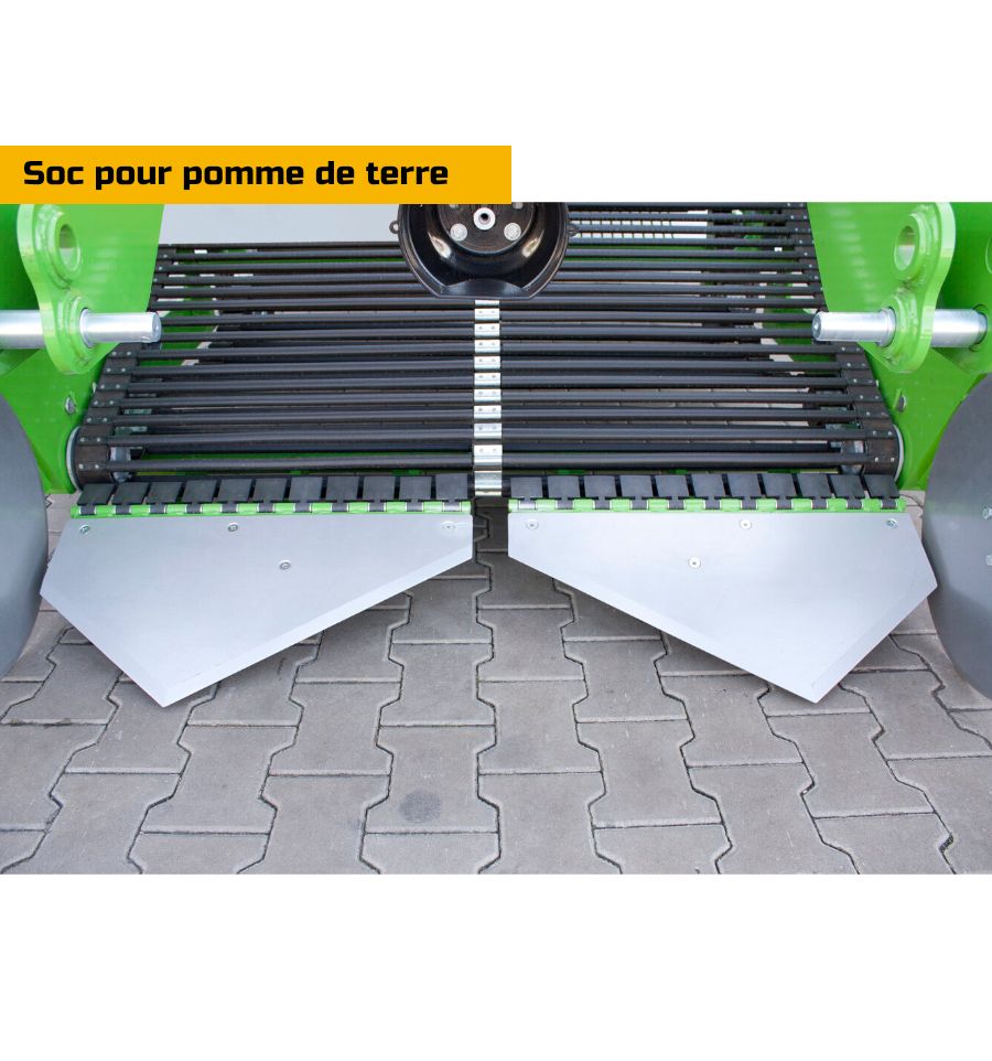 Ses roues espacées assurent une meilleure stabilité. Vous trouverez à l'arrière des goulottes d'évacuation permettant d'éjecter les tubercules vers l'arrière. Ces grilles sont placées ainsi, afin que les tubercules récoltés, ne soient pas endommagées par les roues.
